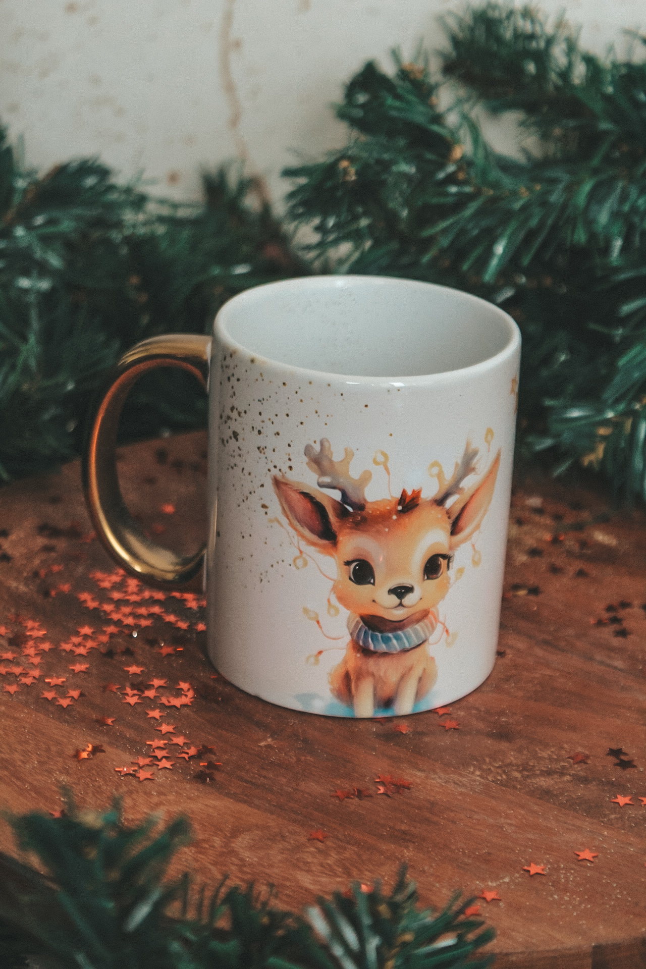 • Caneca branca com ilustração de veado bebé com cornos decorados, asa dourada, sobre mesa de madeira com estrelas e pinheiro