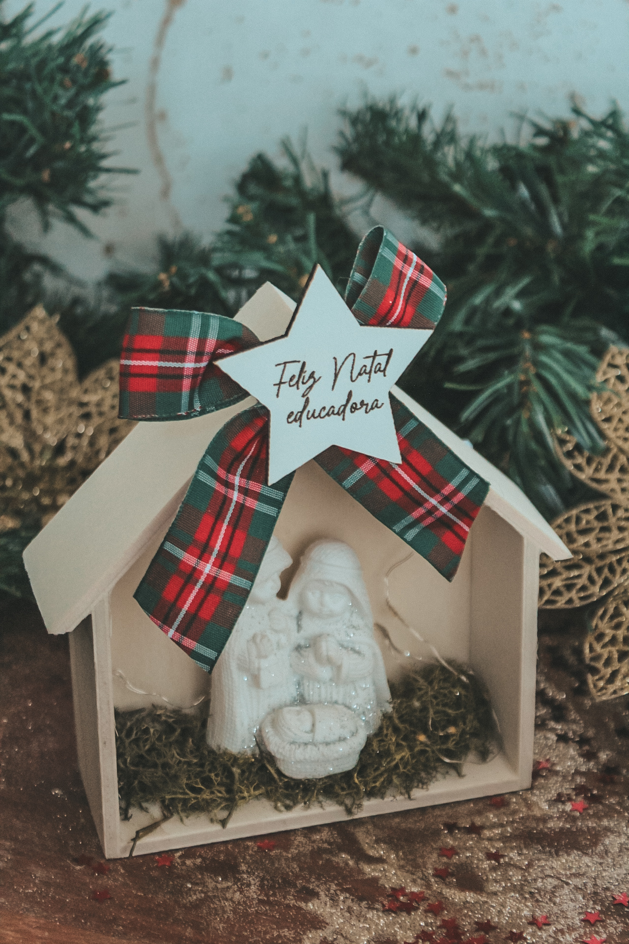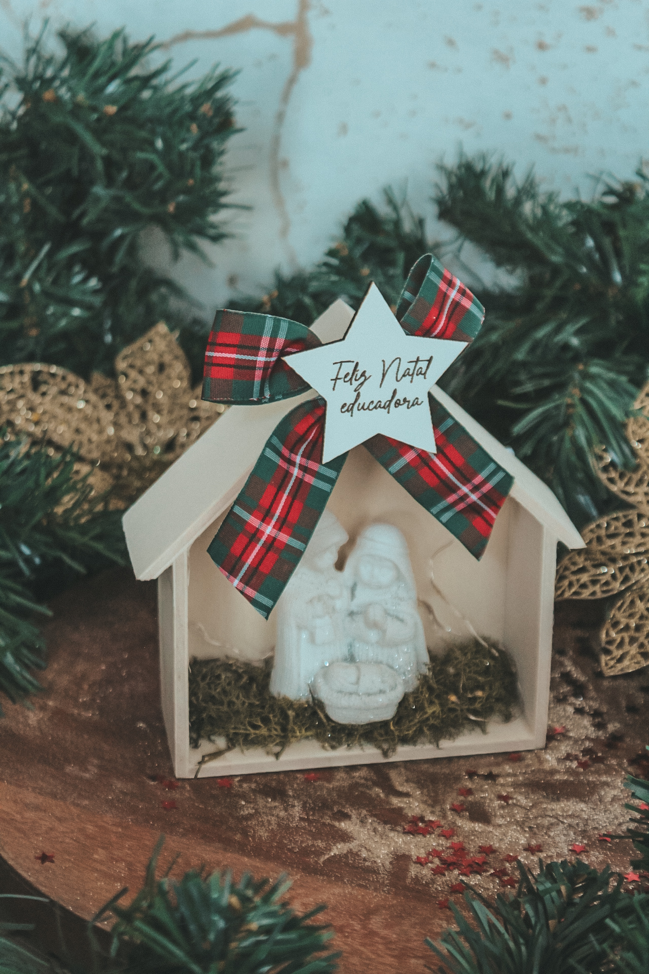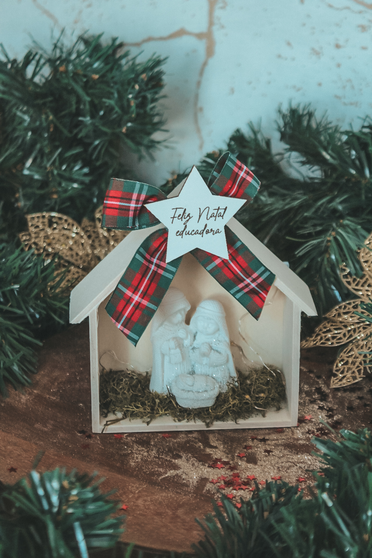 • Presépio decorativo de Natal em madeira branca com laço xadrez e estrela com texto 'Feliz Natal educadora'.