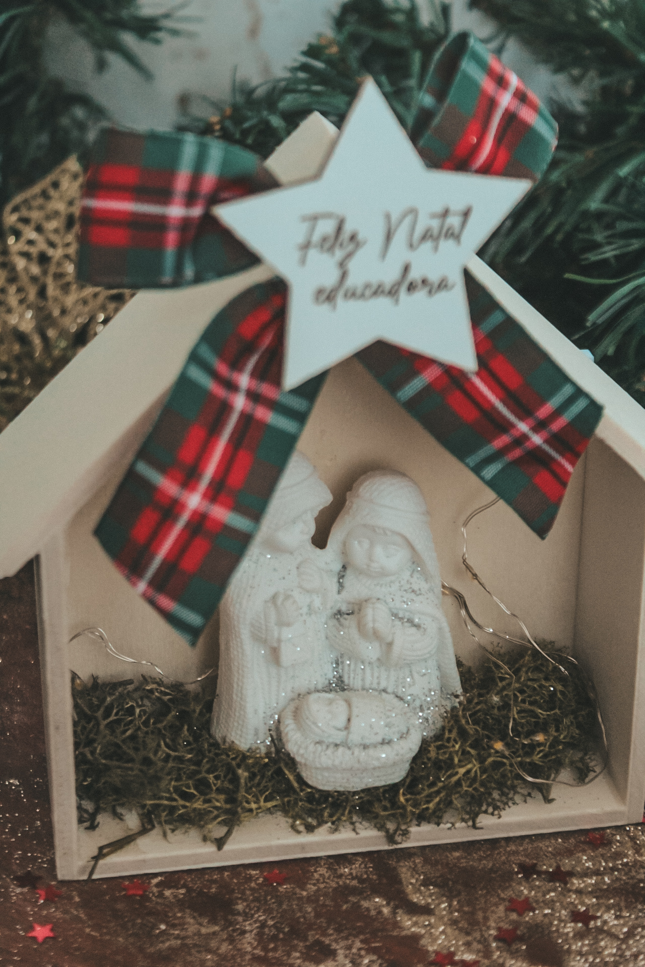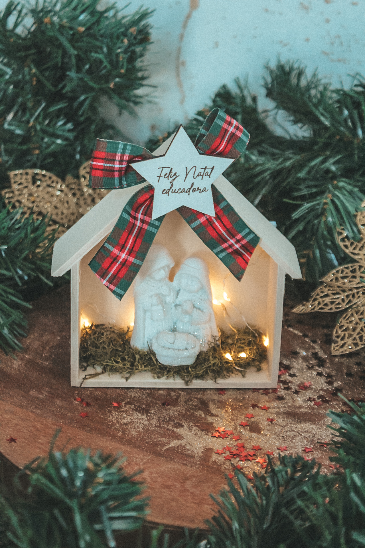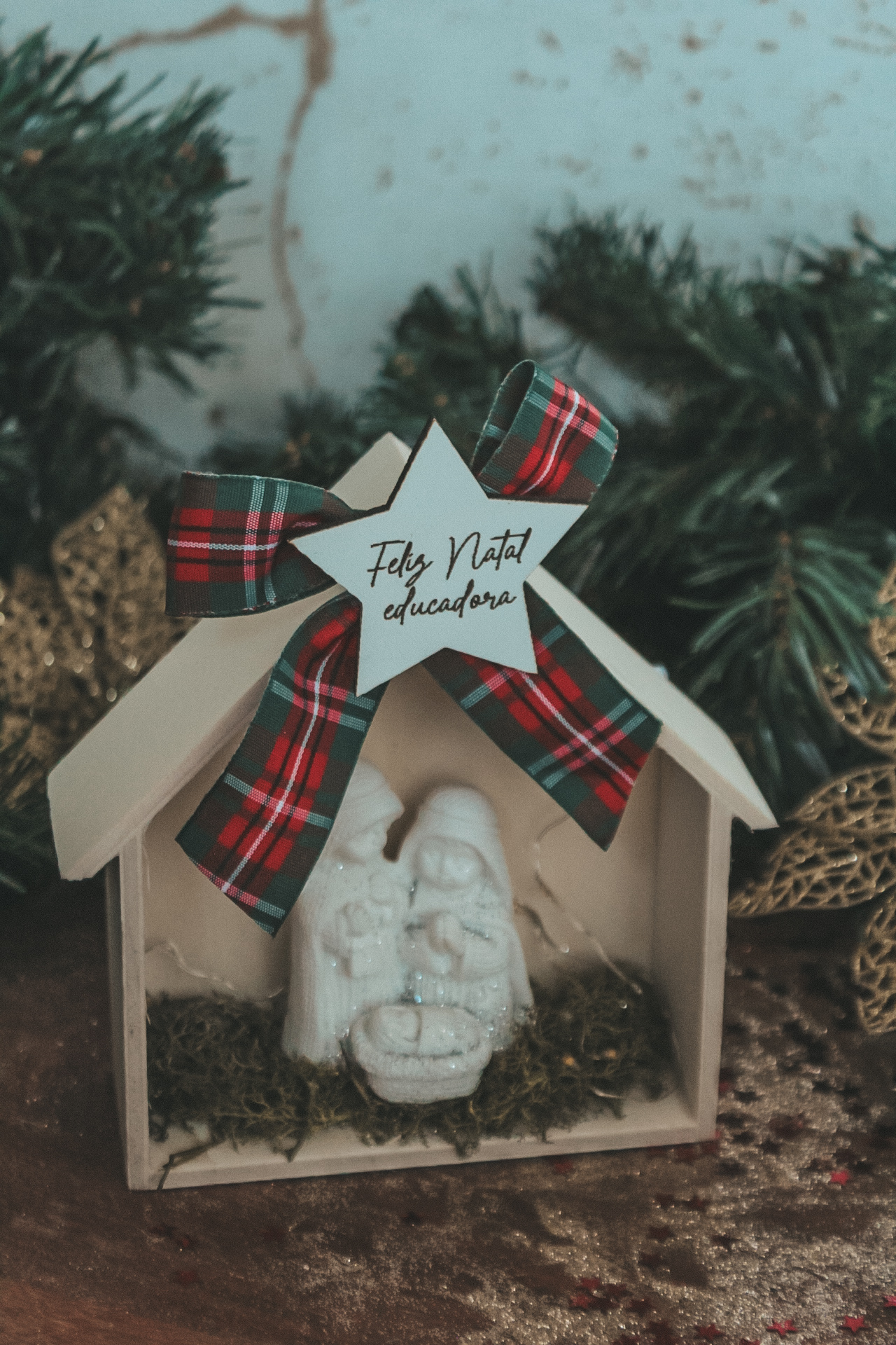 • Presépio decorativo de Natal em madeira branca com laço xadrez e estrela com texto 'Feliz Natal educadora'.