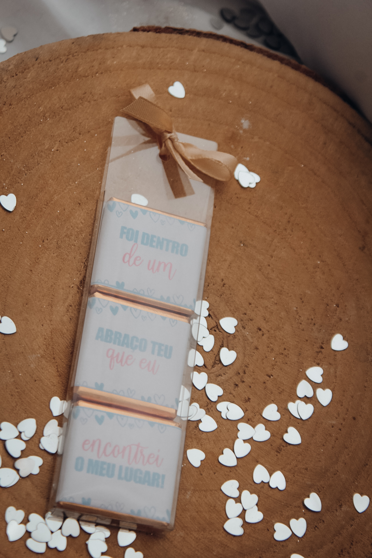 • Três chocolates embrulhados com texto em papel branco, colocados sobre base de madeira, com confetes em forma de coração branco.