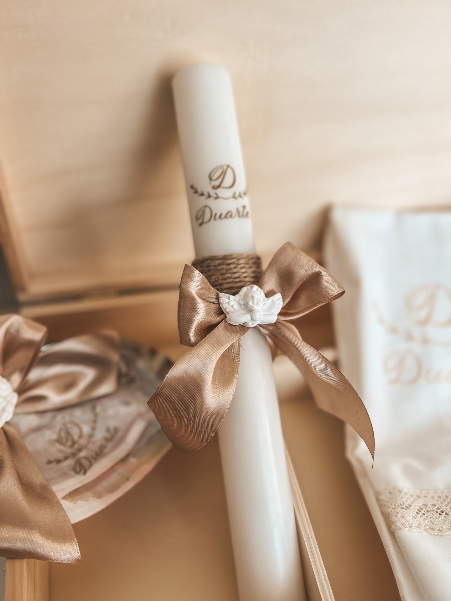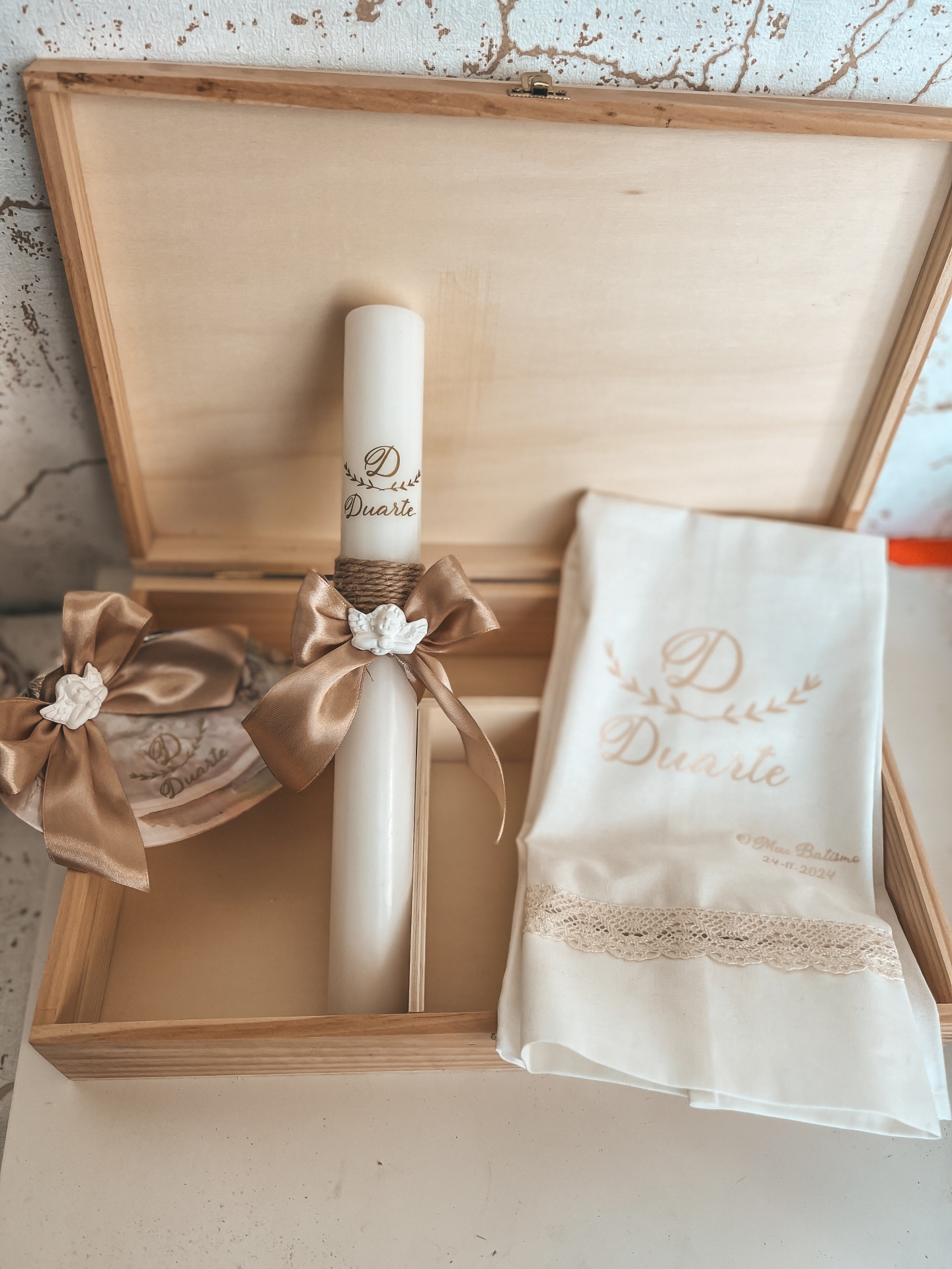 • Conjunto de batismo com vela, toalha e almofada numa caixa de madeira