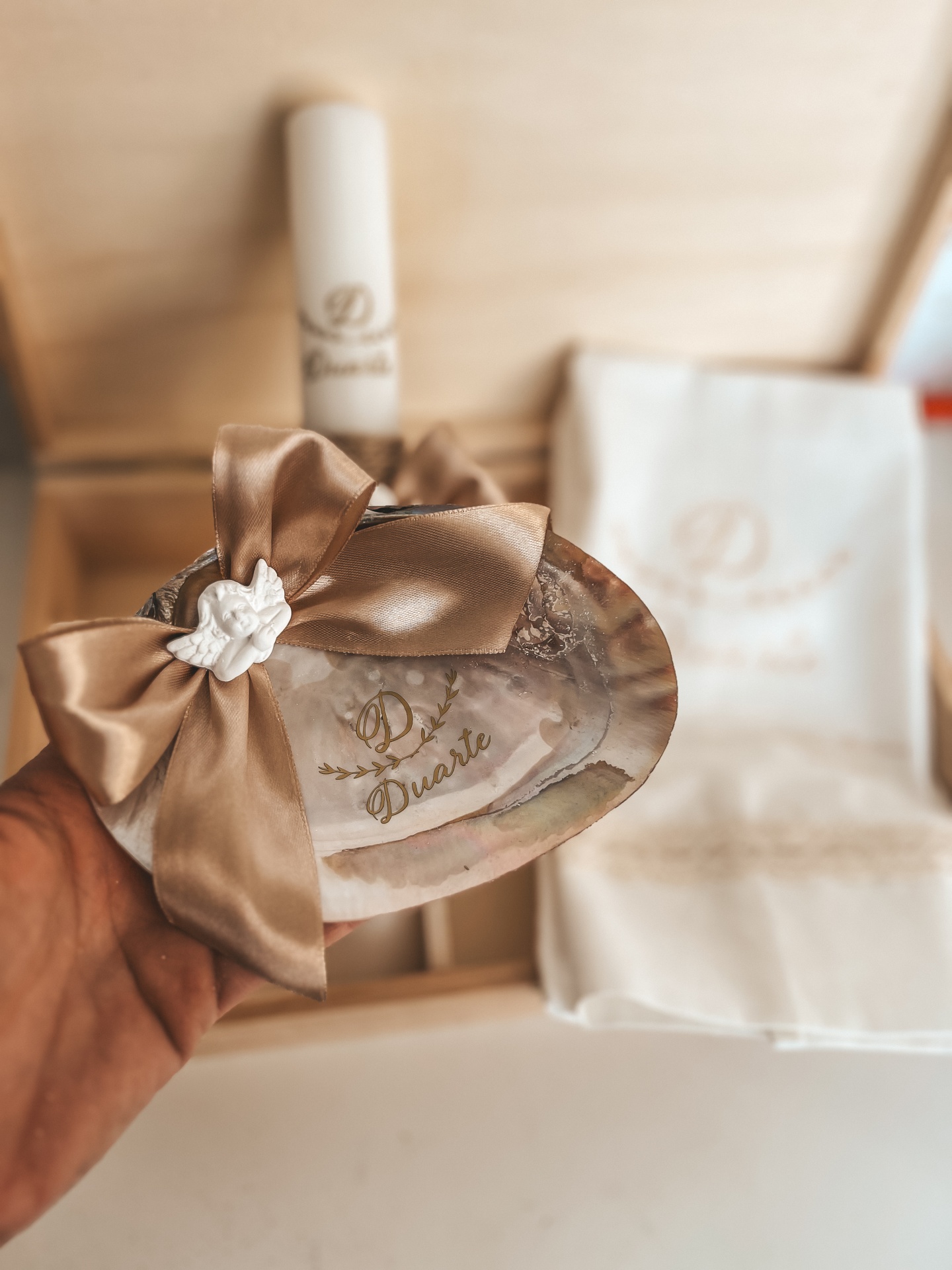 • Toalha branca com renda bege e texto dourado 'D Duarte' segurada por mão com pulseiras