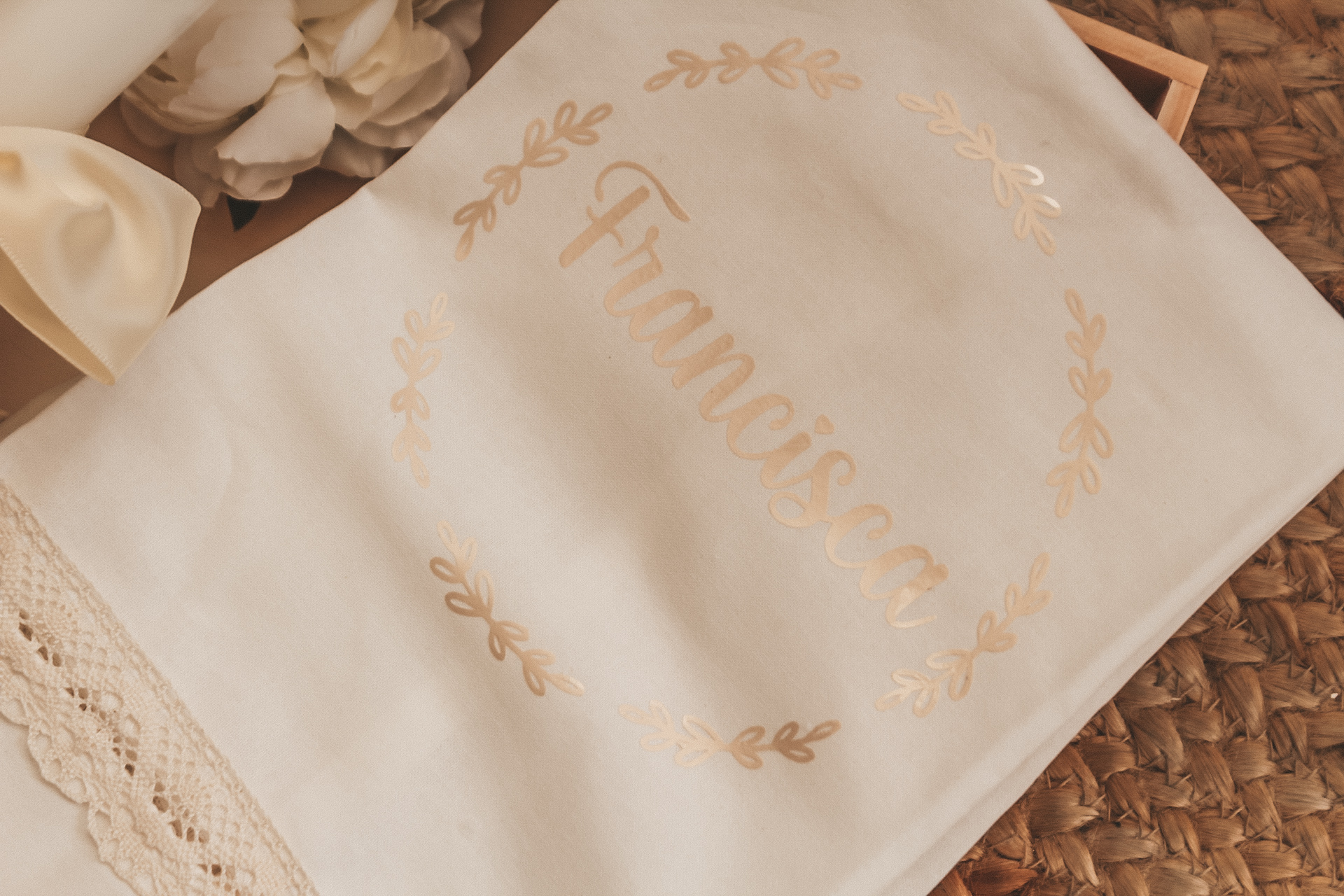 • Toalha branca com nome Francisca em relevo dourado e bordado de renda