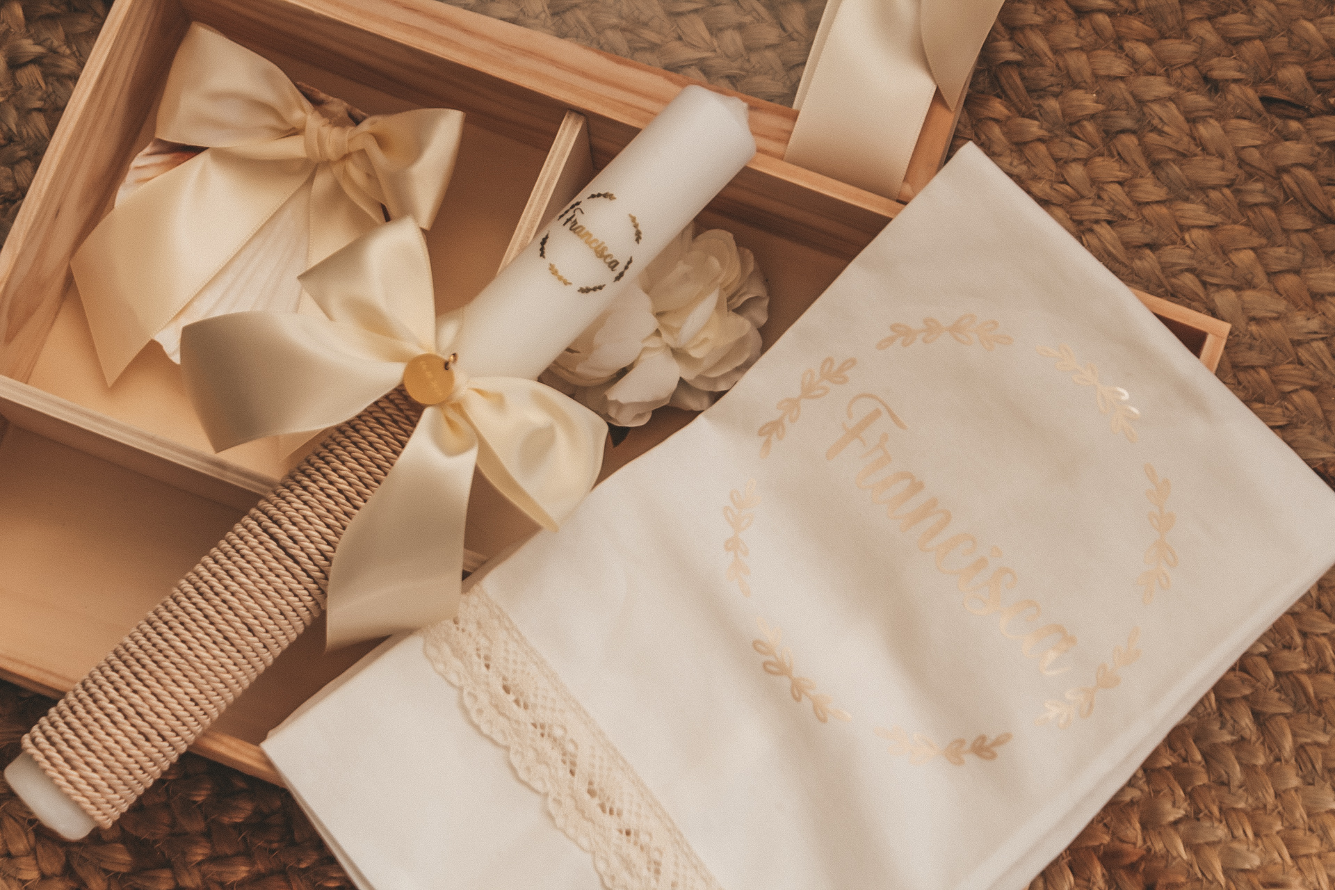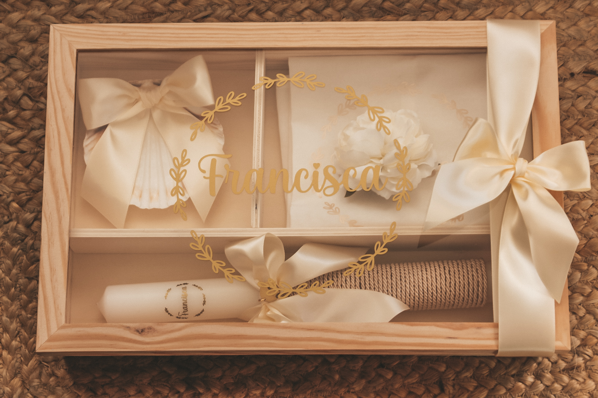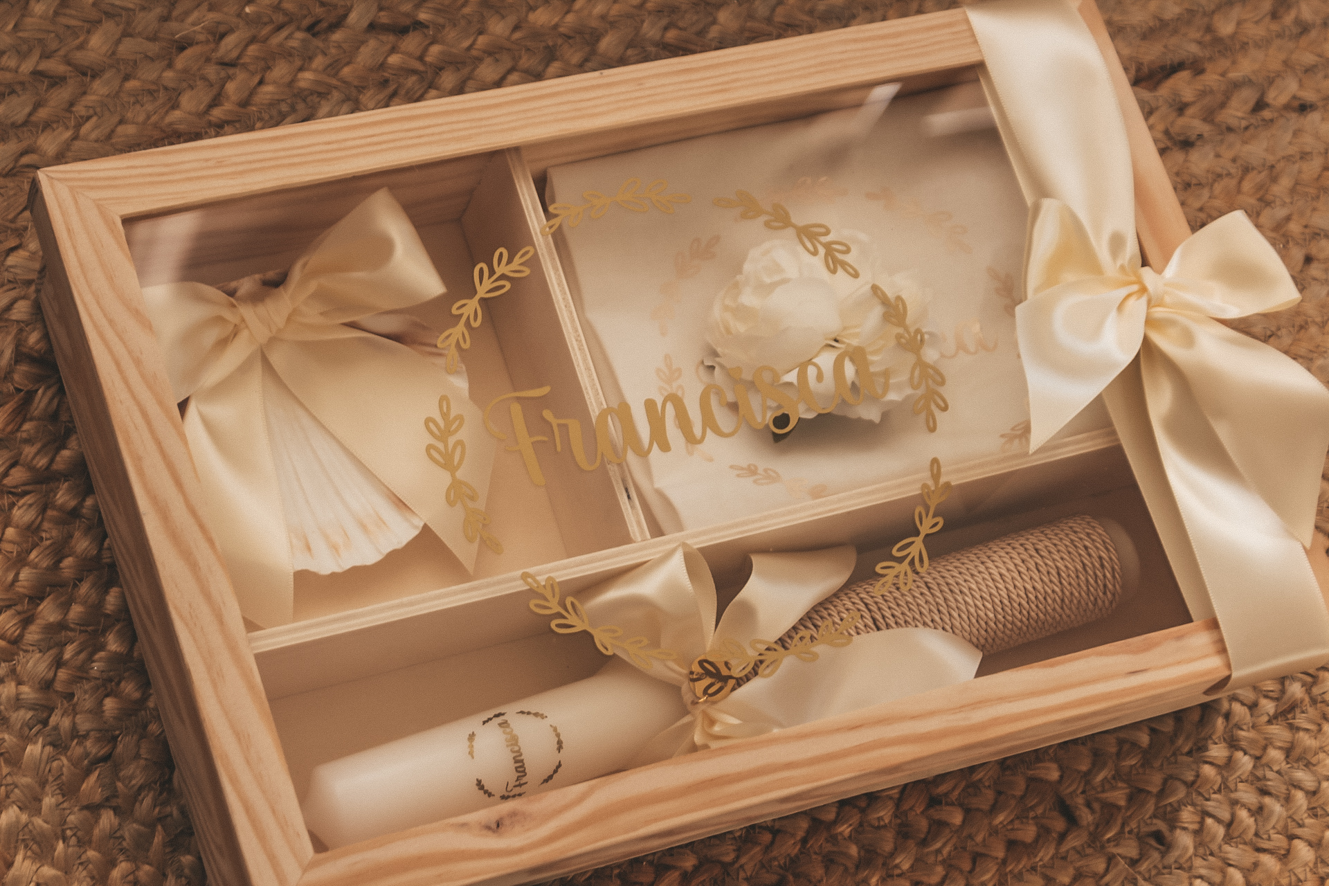 • Conjunto para bebé em caixa de madeira com tampa de vidro decorada com o nome FRANCISCO em letras douradas.