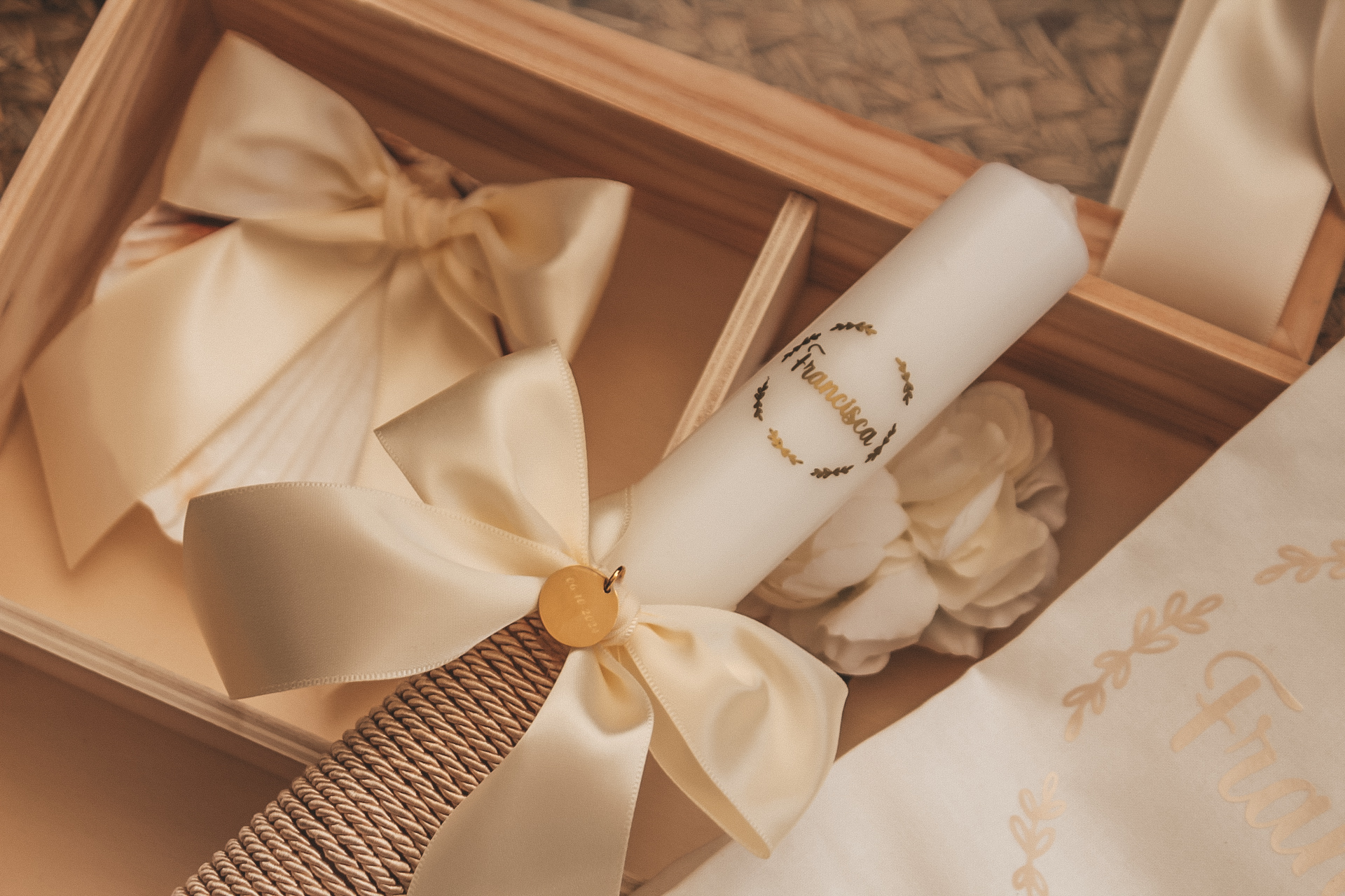 • Conjunto de vela decorativa com laço e caixa de madeira