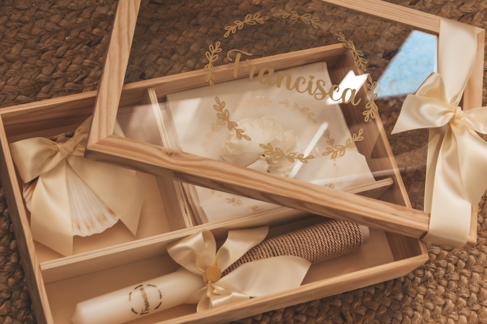 • Caixa de madeira com leque, rolo de juta e envelope, decorado com fitas de cetim creme