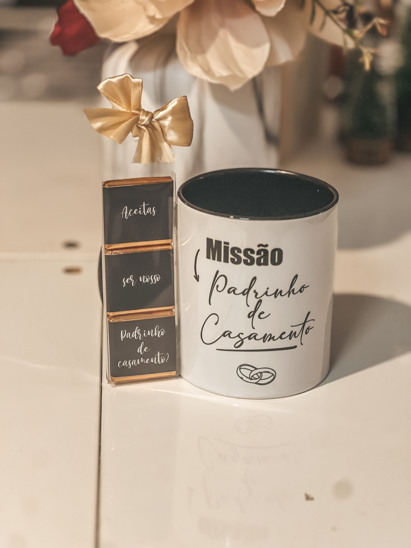 • Caneca branca com interior preto e mensagem para padrinho de casamento ao lado de chocolates com embalagem preta e dourada e fita dourada.