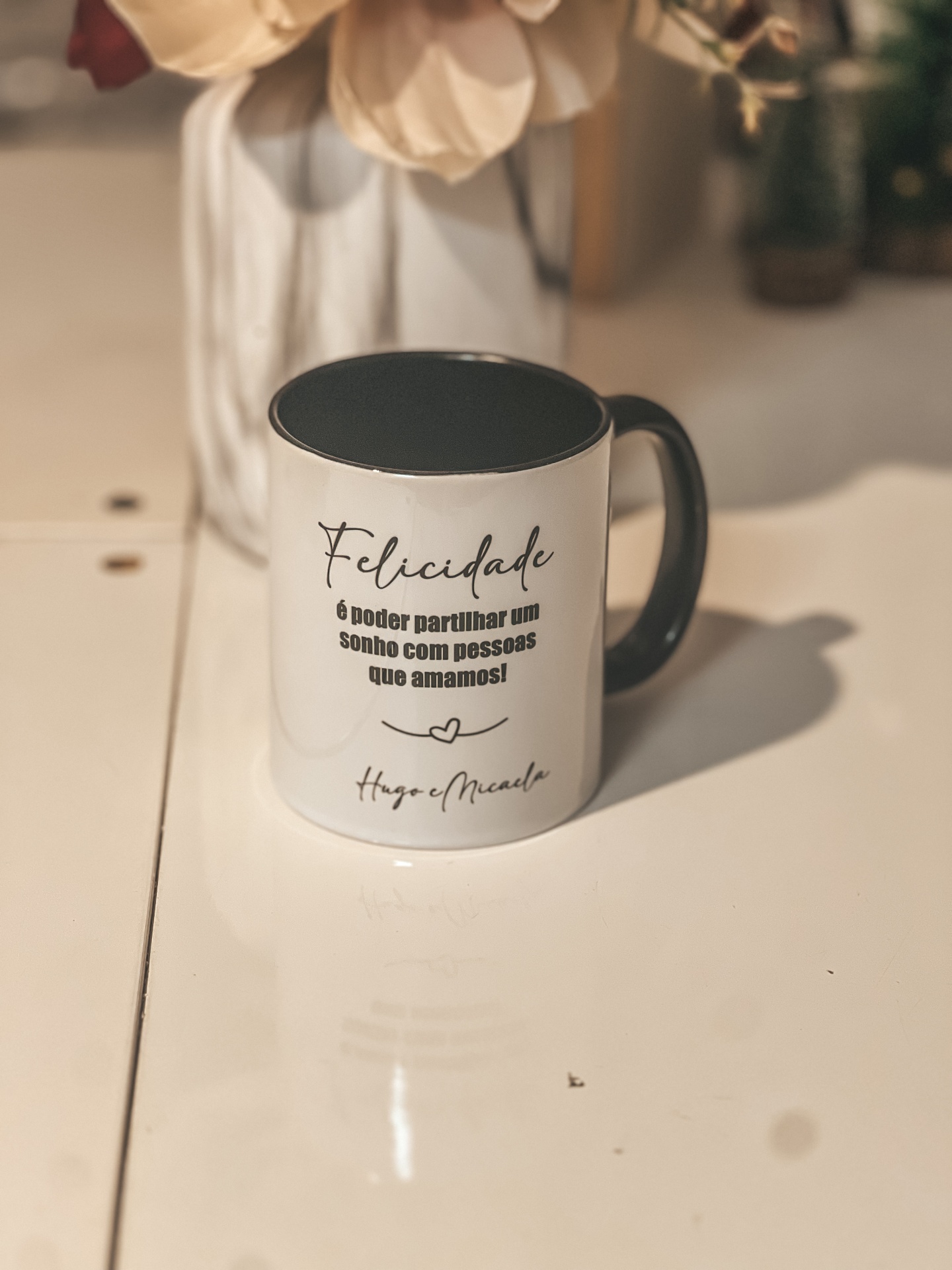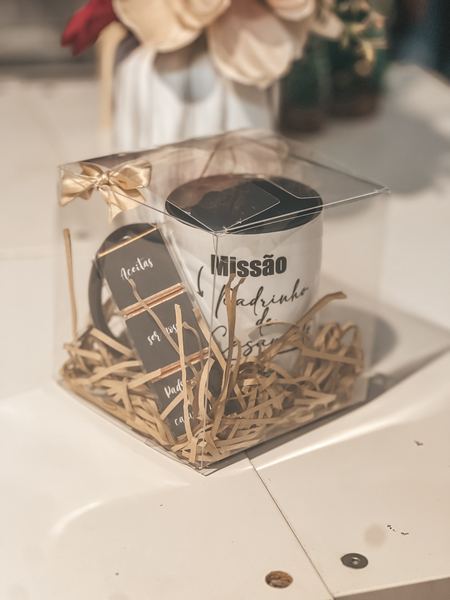 • Caneca personalizada em caixa transparente com cartão e laço dourado
