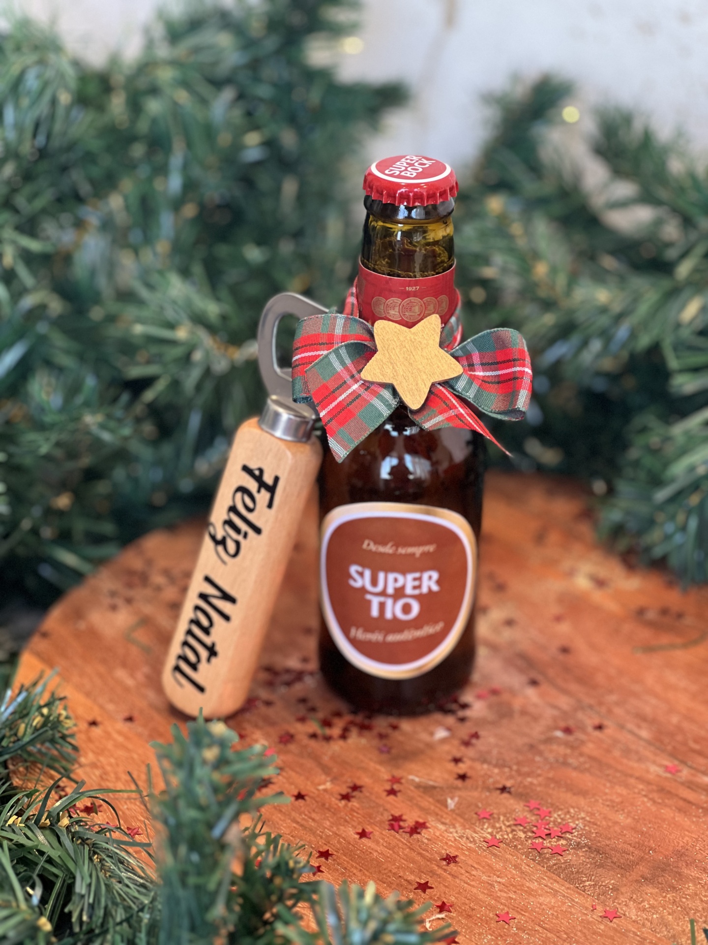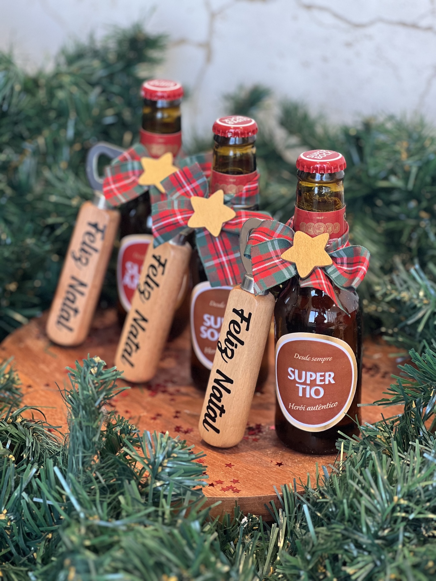 • Garrafa de cerveja decorada com laço e estrela, abridor de garrafas em madeira escrito 'Feliz Natal'
