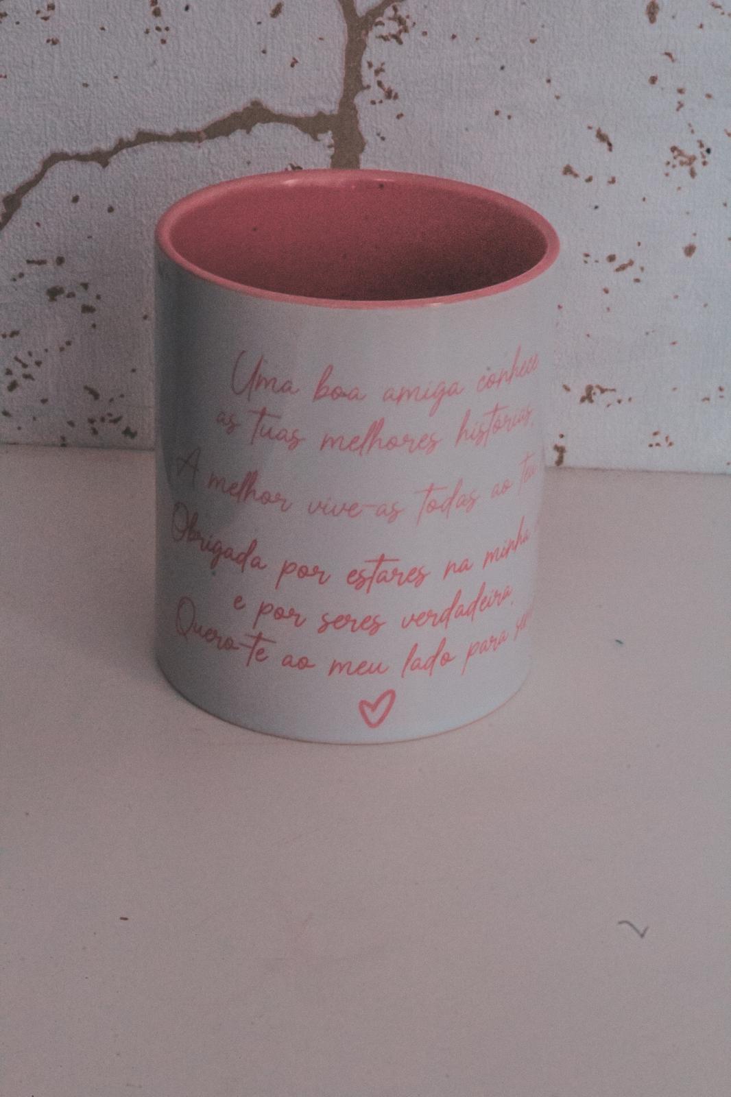 • Caneca branca com interior rosa e texto em rosa apoiada numa superfície branca