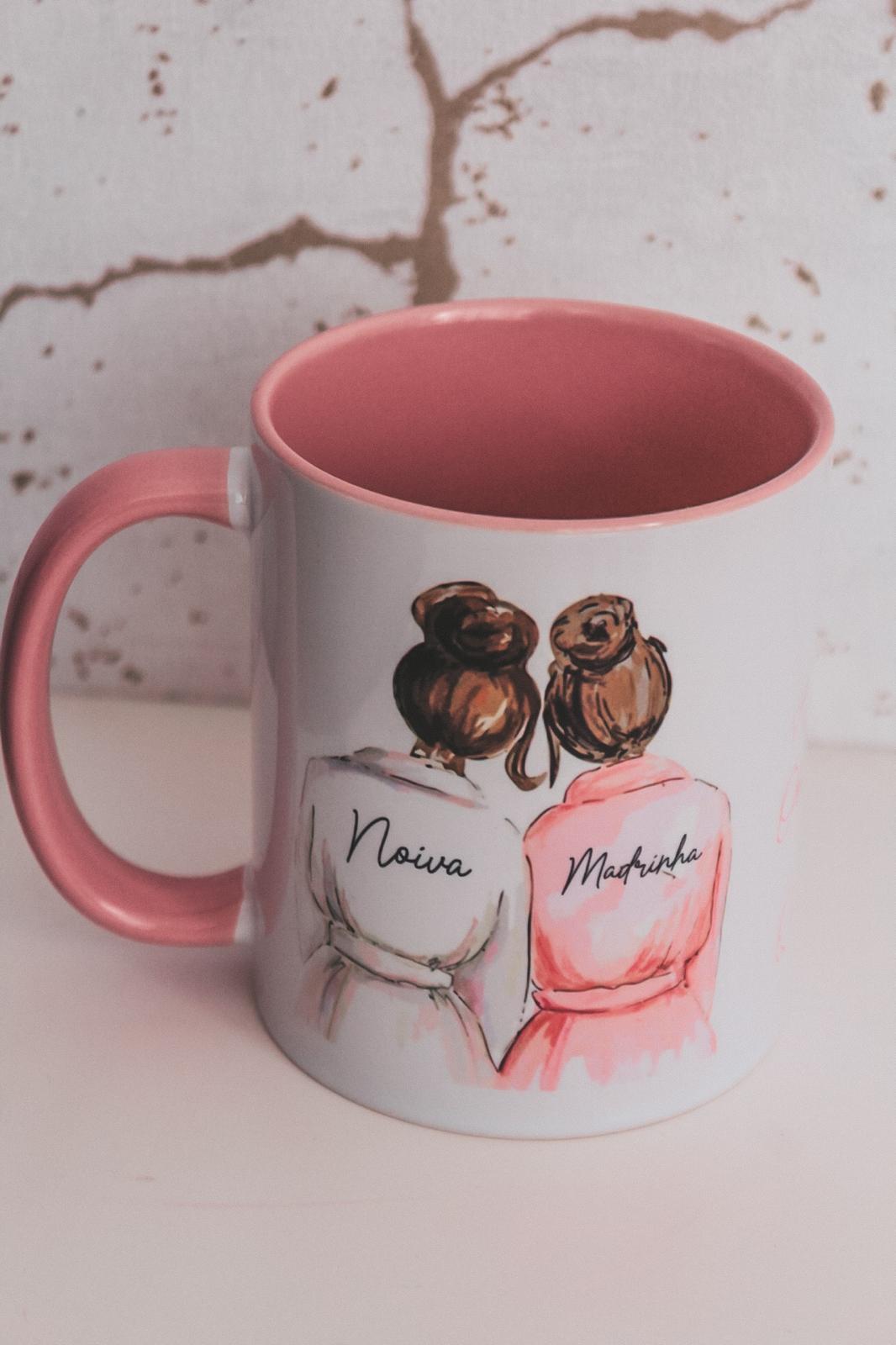 • Caneca cerâmica decorada com ilustração e textos Noiva e Madrinha