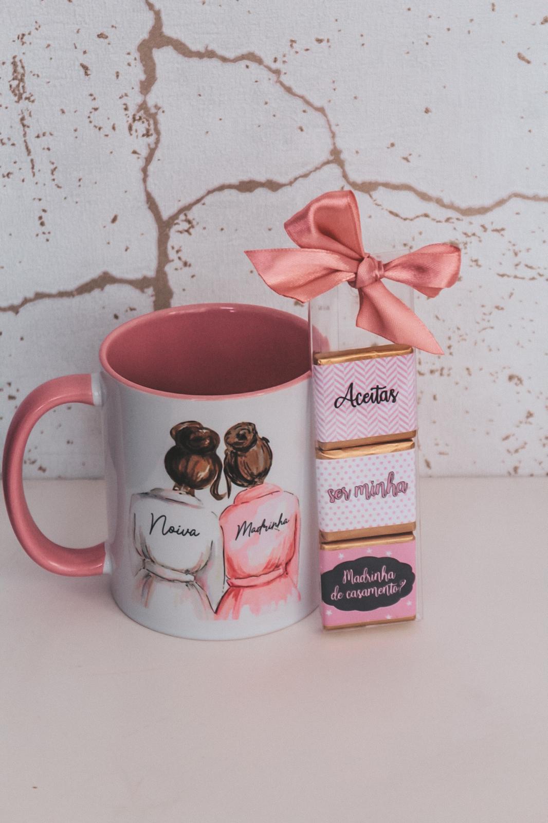 • Caneca branca e rosa com ilustração de noiva e madrinha e barra de chocolate com laço rosa
