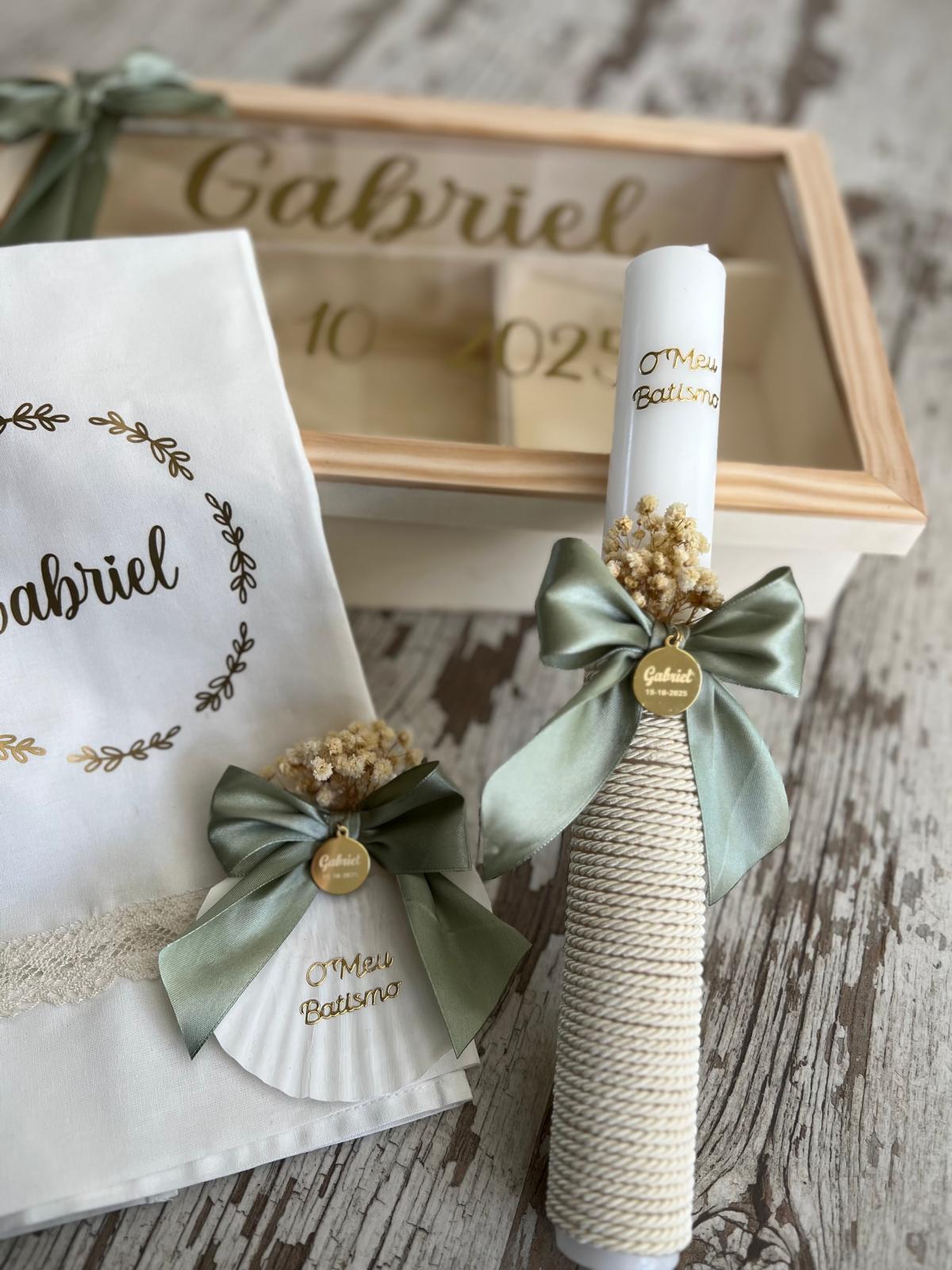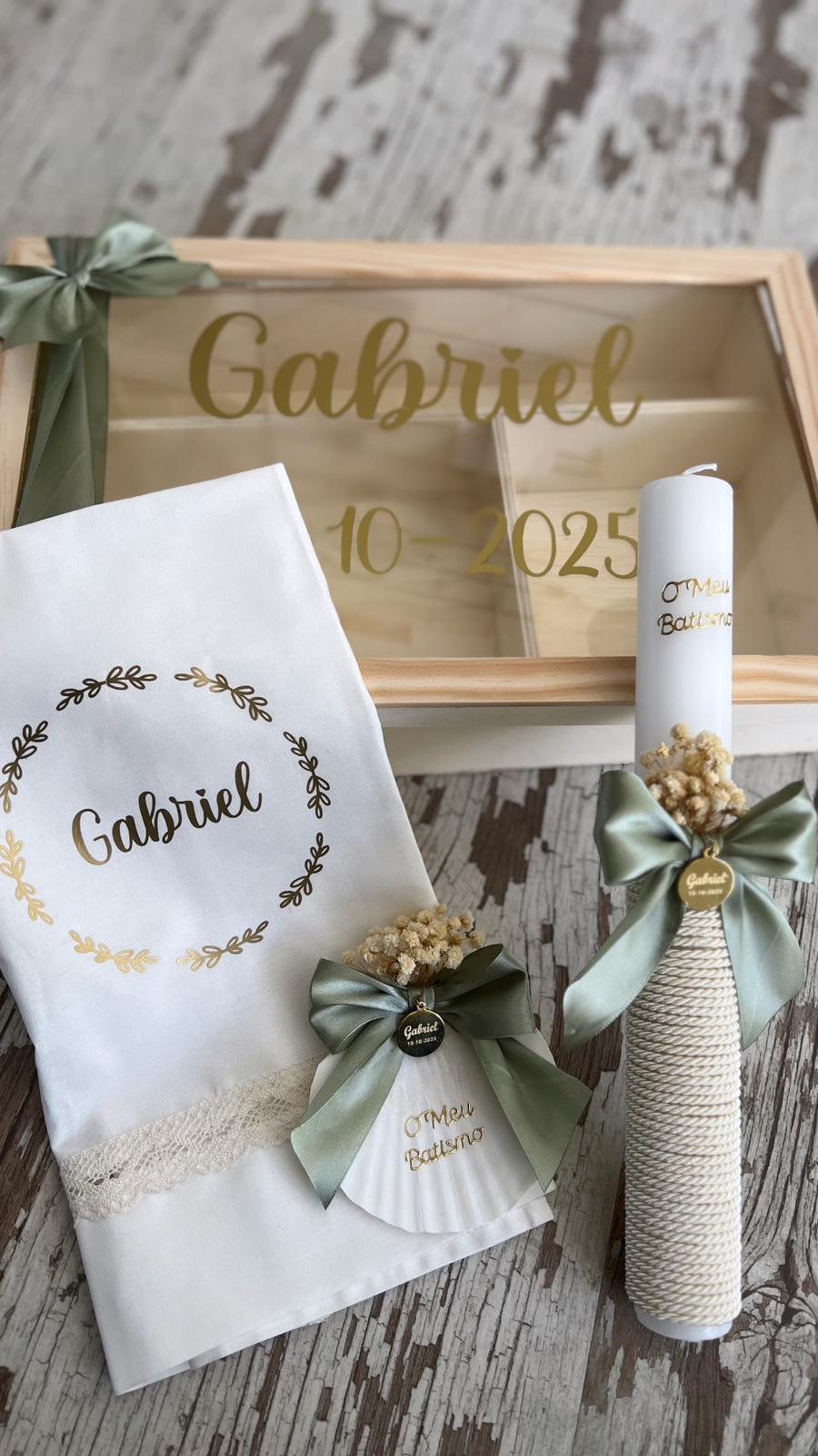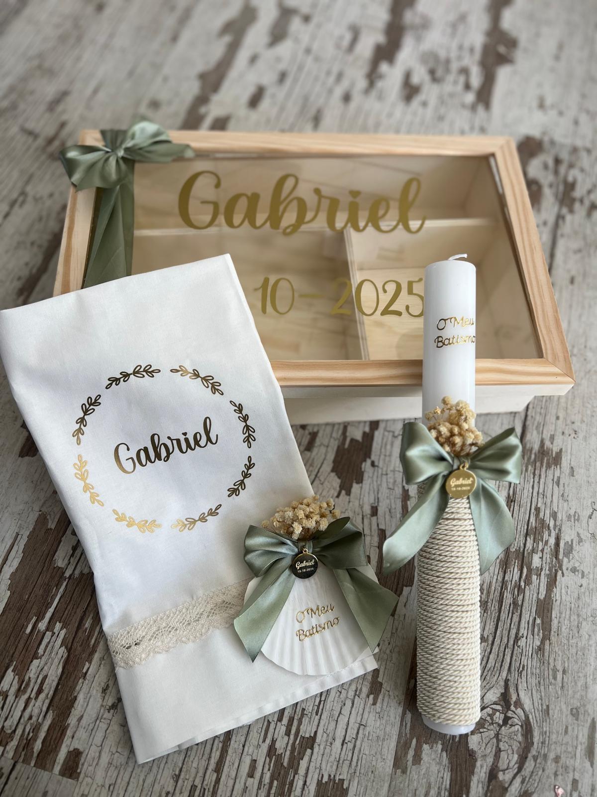 • Conjunto de caixa de madeira, pano bordado e vela decorada para batismo com o nome Gabriel.