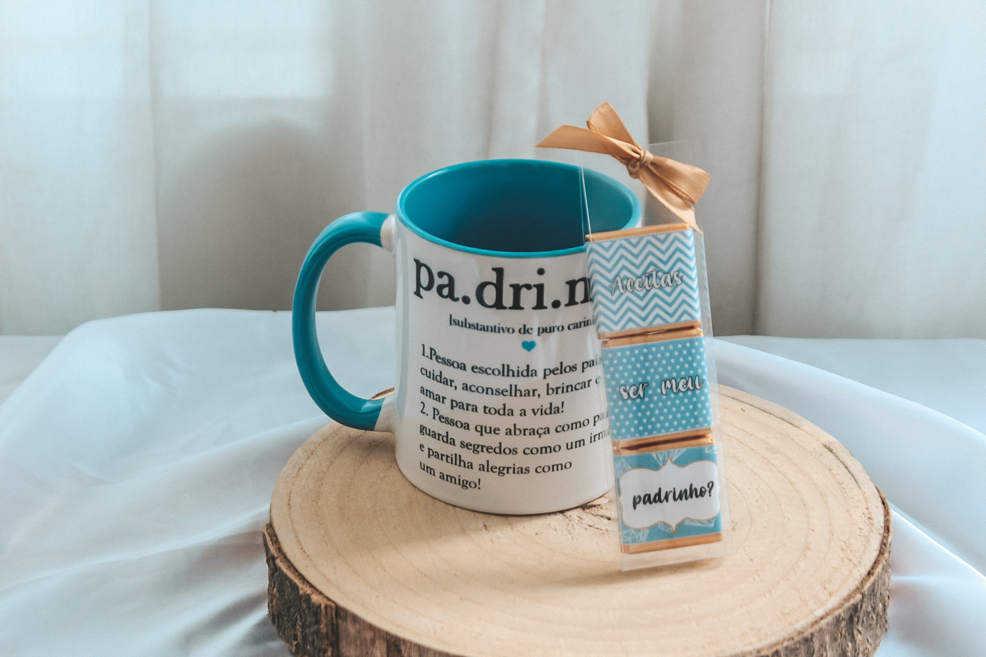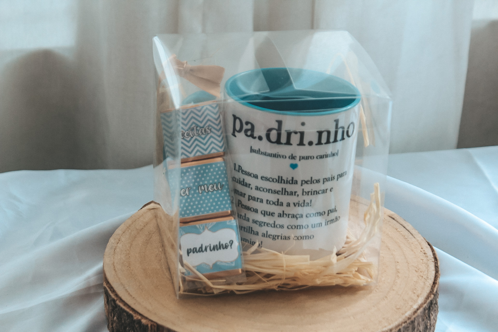 • Embalagem retangular azul com texto 'Queres ser meu Padrinho?' sobre base de madeira