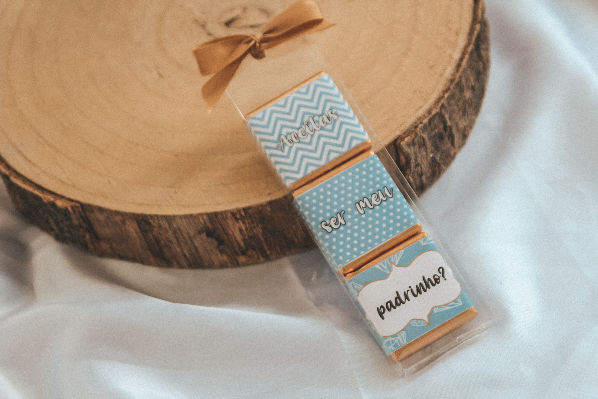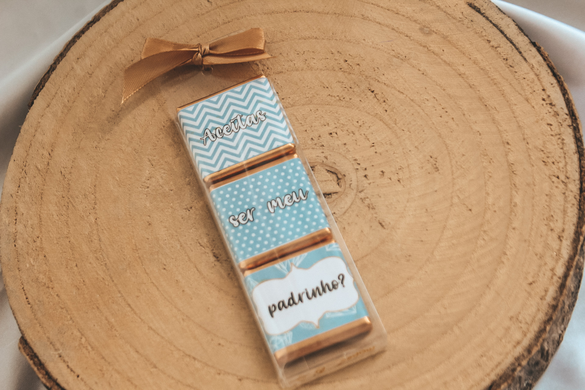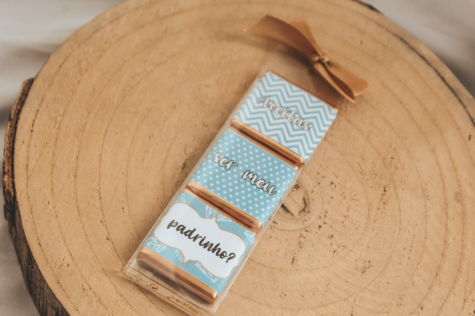 • Embalagem transparente com chocolates decorados e texto ser meu padrinho, em fundo branco e base de madeira