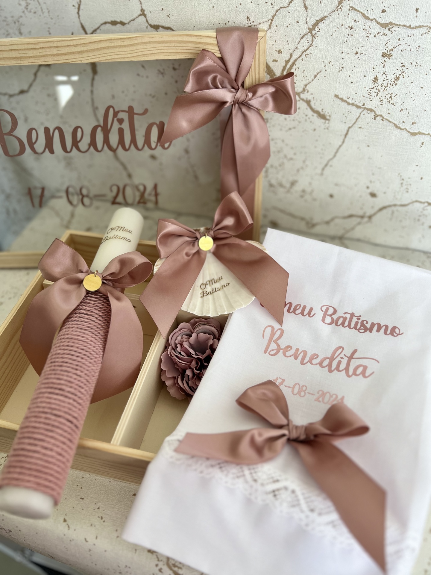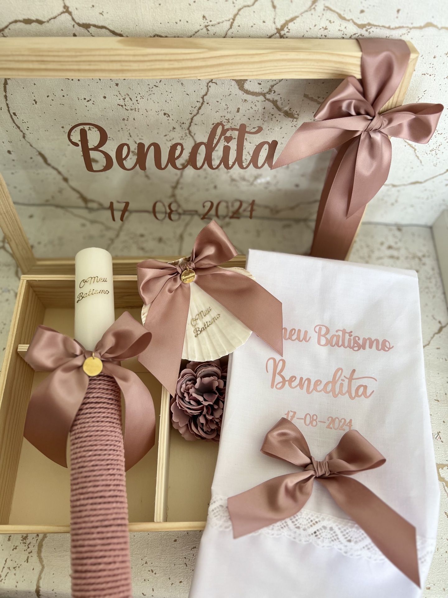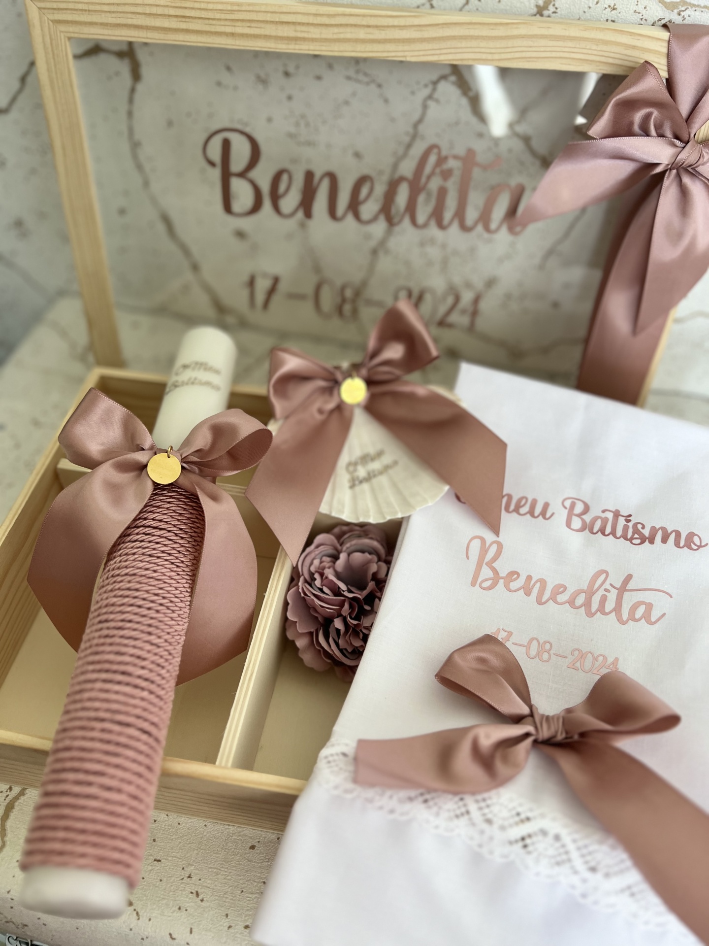 • Conjunto de batismo com vela, toalha, laço e caixa decorativa com nome e data