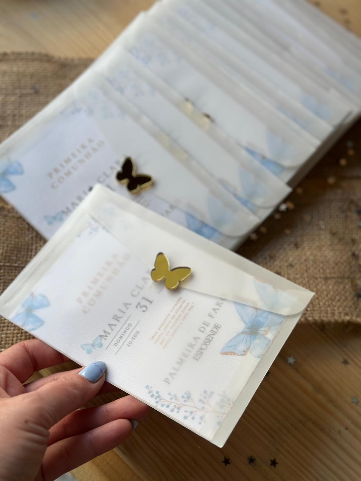 • Convite de primeira comunhão com envelope translúcido e pin de borboleta dourado.