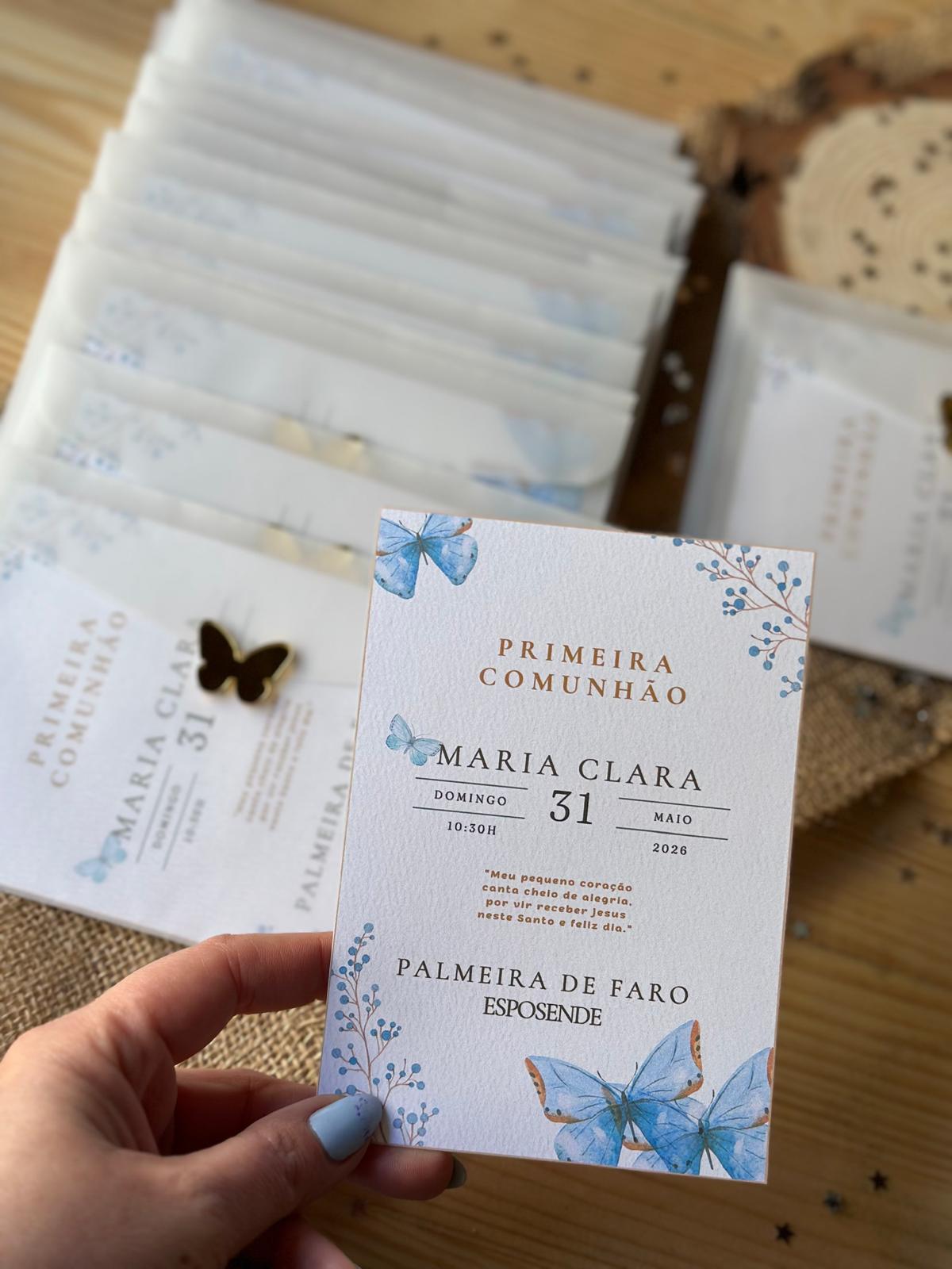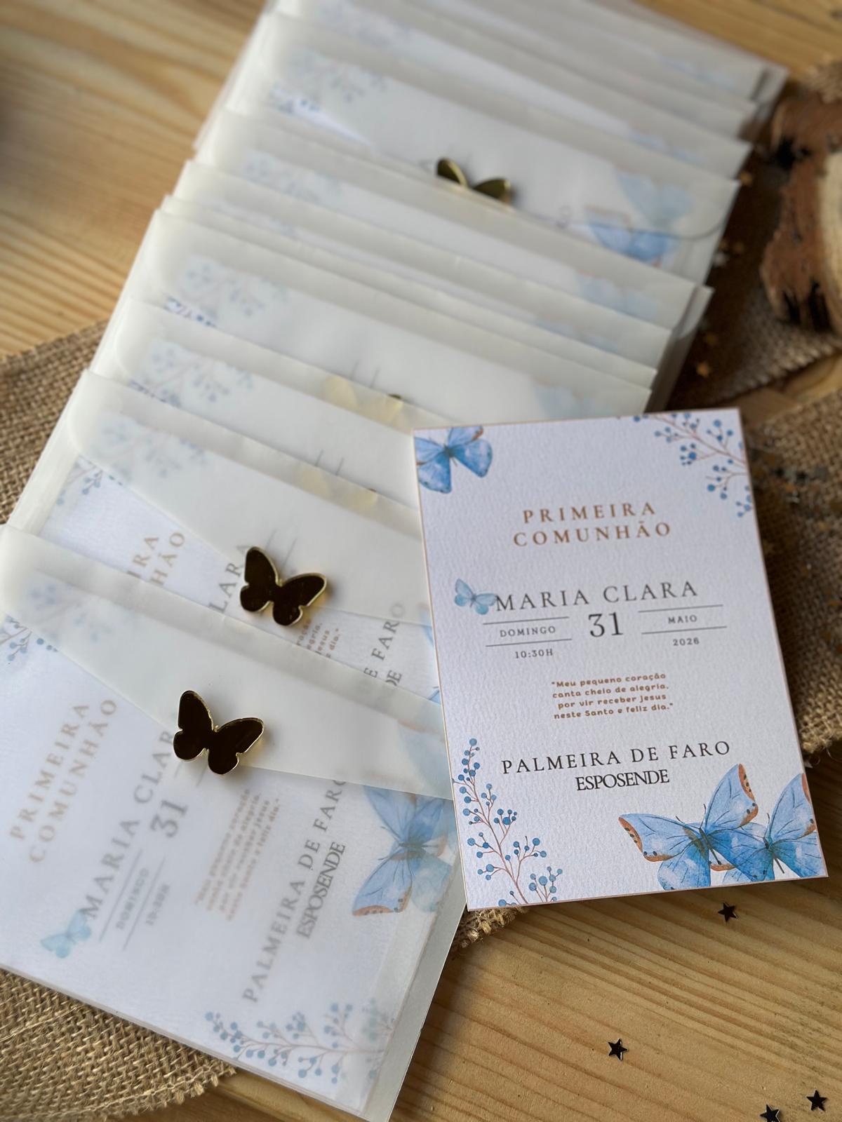 • Convites de Primeira Comunhão com borboletas azuis e fecho em forma de borboleta dourada.