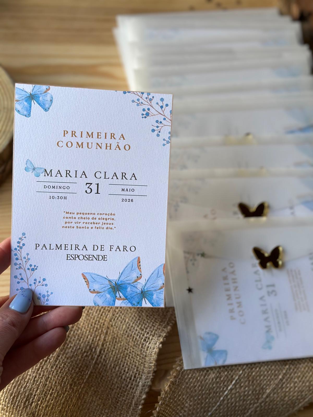 • Convite para Primeira Comunhão com borboletas azuis e texto em papel branco texturizado