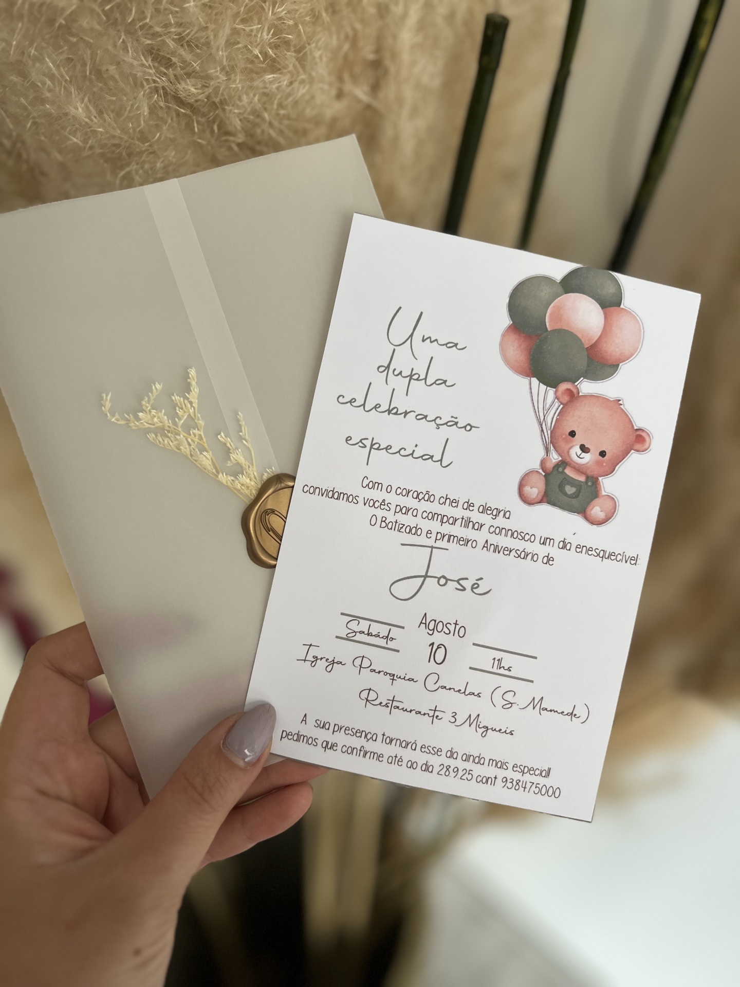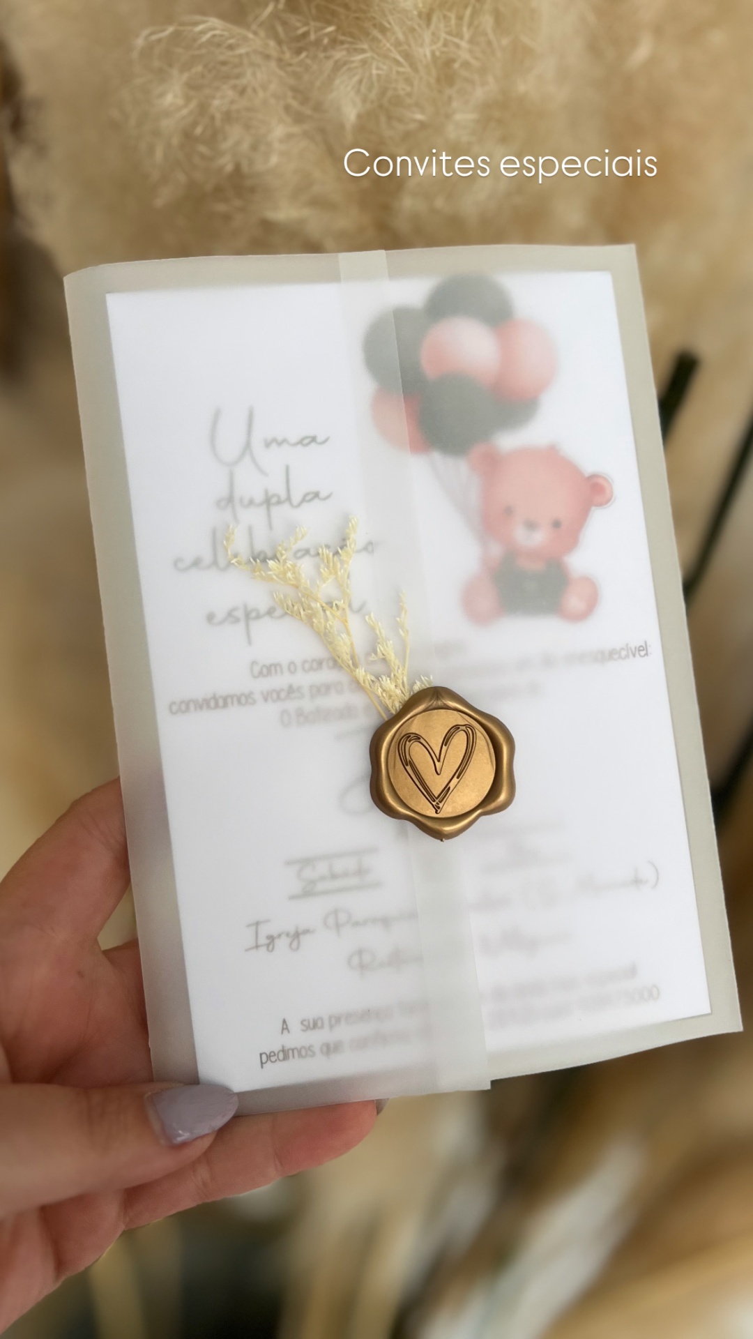 • Convite com papel translúcido, selo de cera dourado com coração e ursinho com balões.