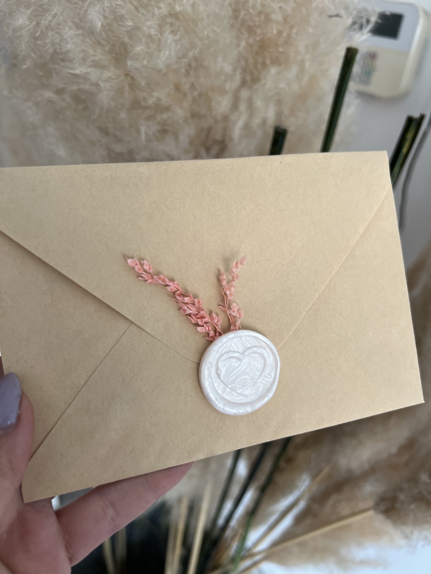 • Envelope bege com selo de cera branco e raminhos secos cor-de-rosa