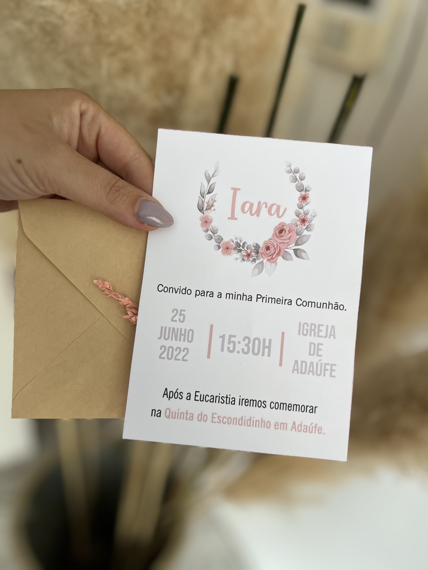• Convite de Primeira Comunhão com design floral em papel branco e envelope bege