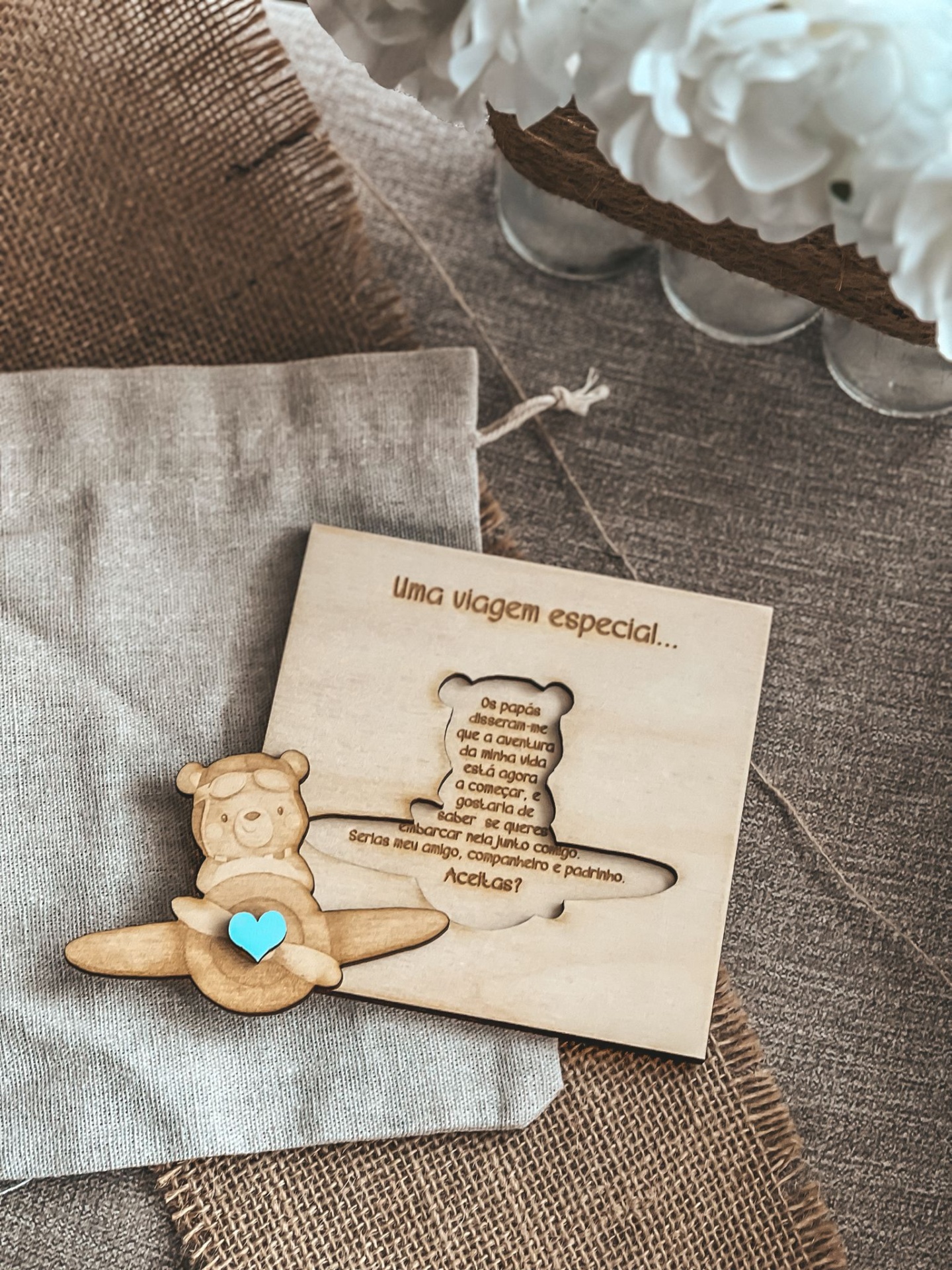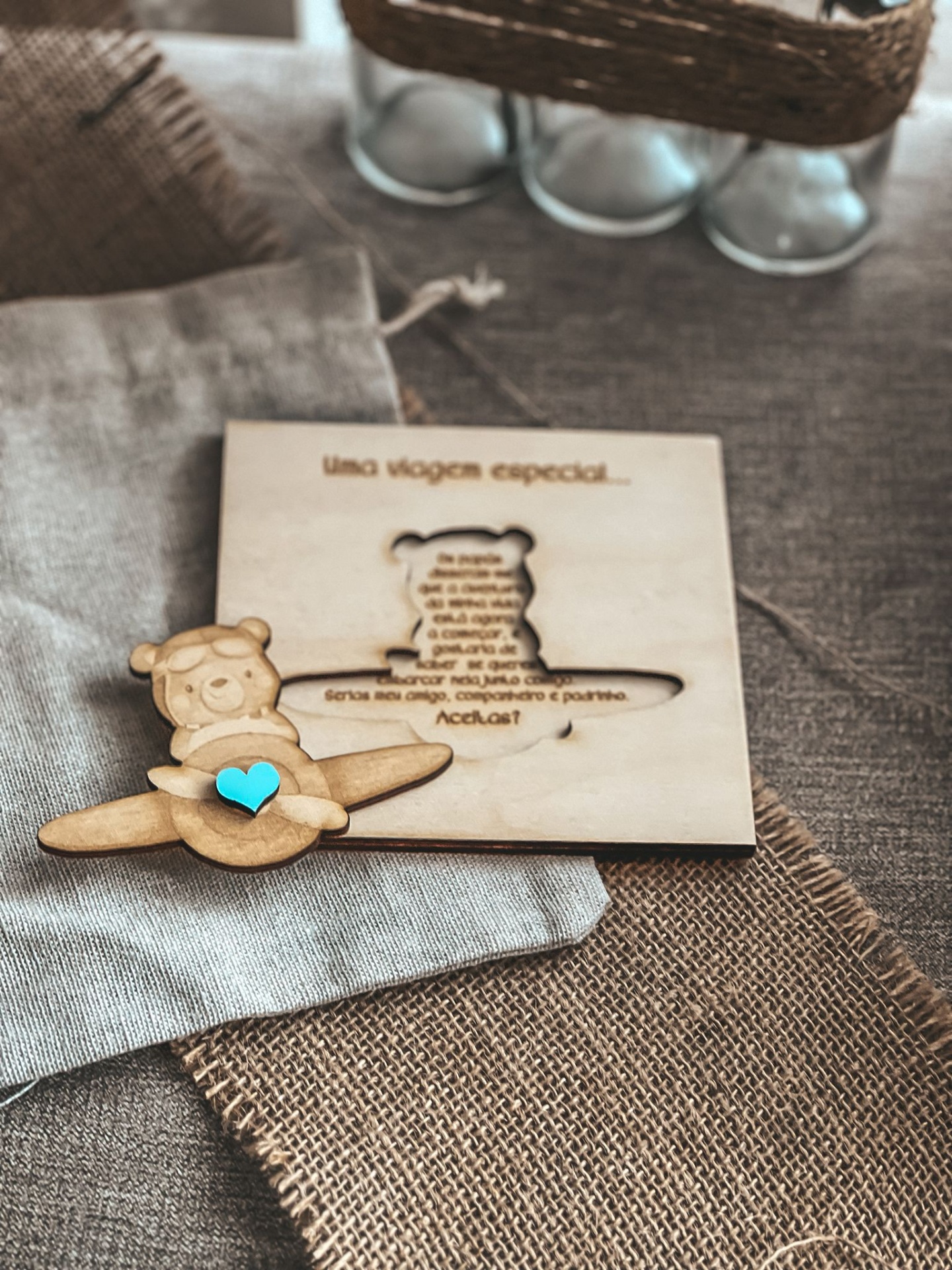 • Convite de madeira com desenho de ursinho em avião e coração azul sobre tecidos rústicos