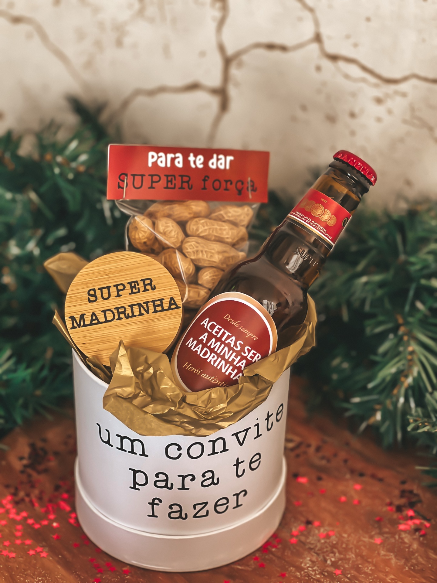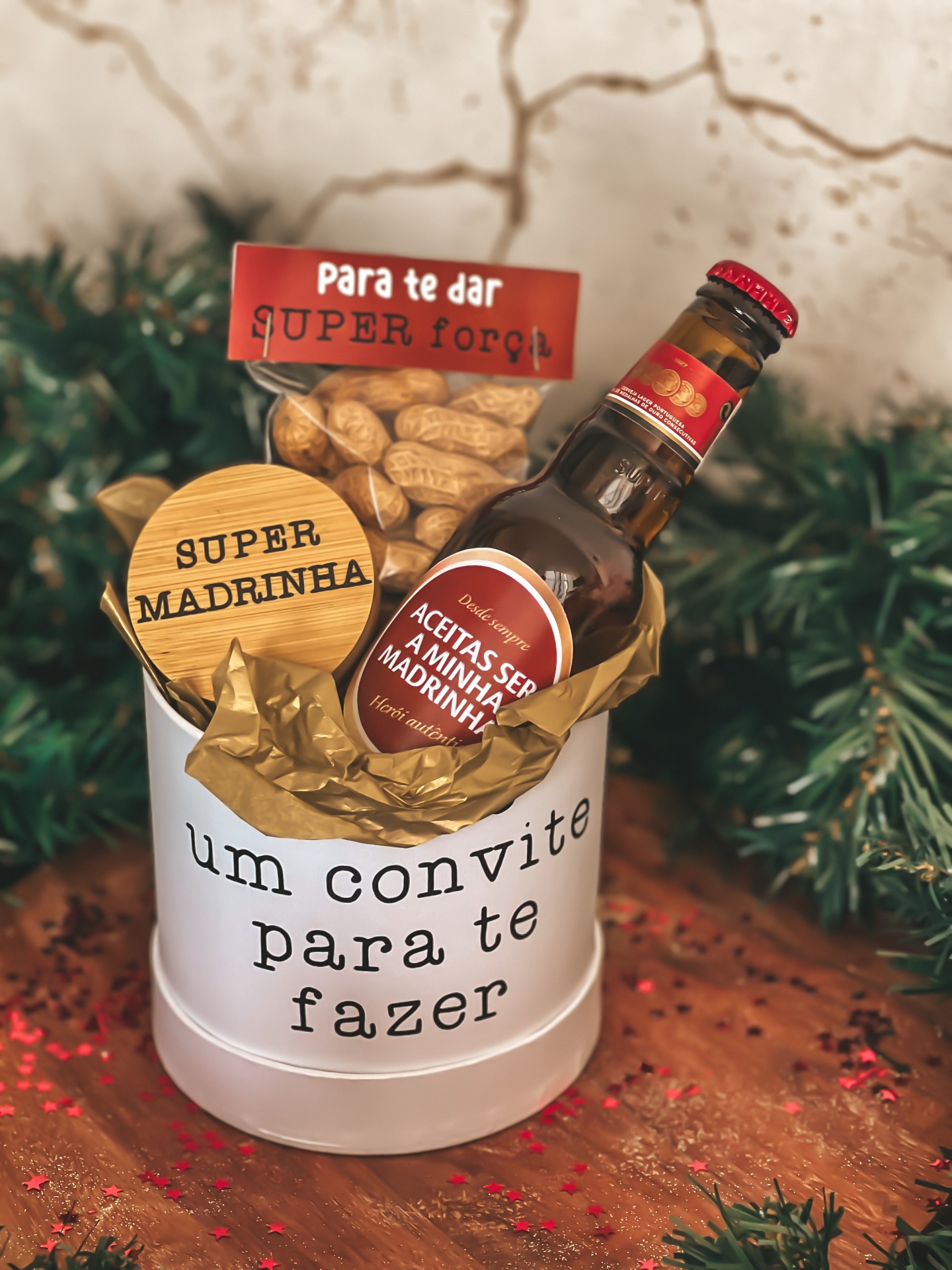 • Conjunto de presente com frasco branco, frasco de madeira, embalagem de amendoins e garrafa com rótulos em português