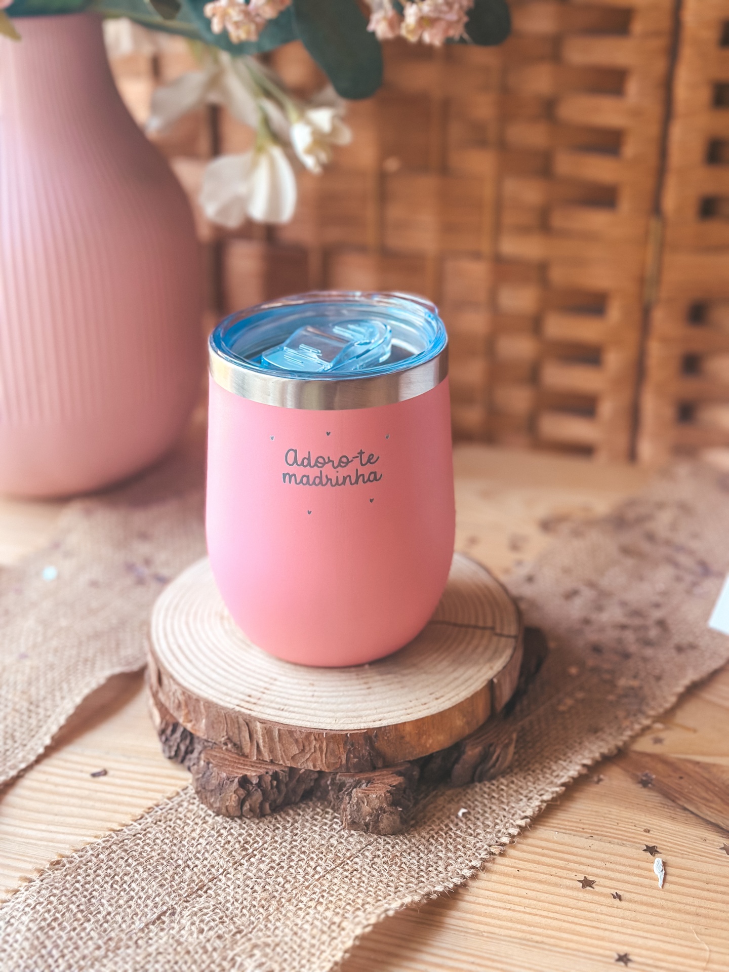 • Copo térmico rosa com tampa azul sobre base de madeira, texto Adoro-te madrinha
