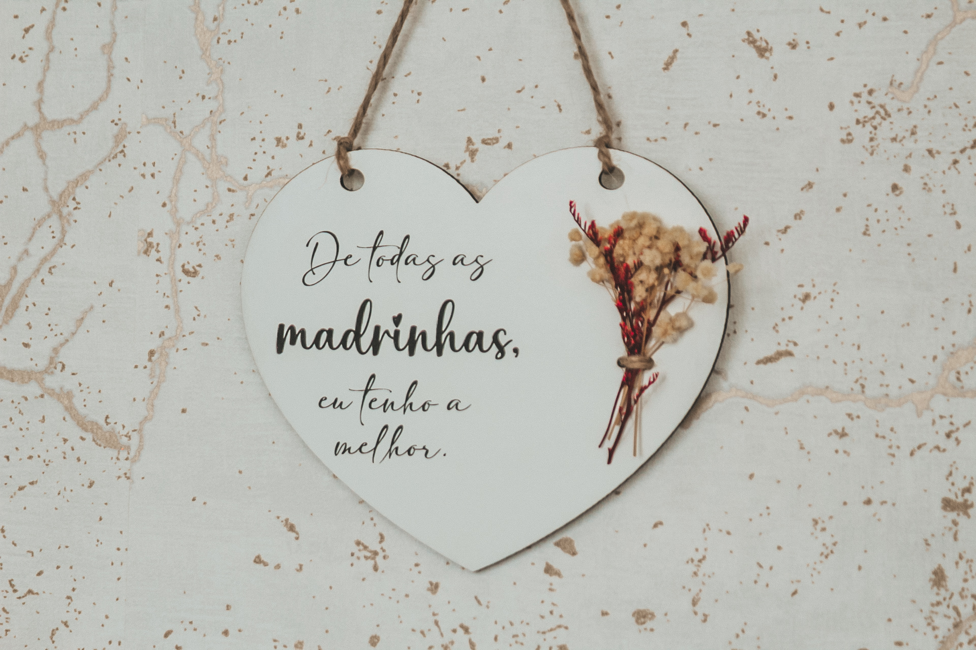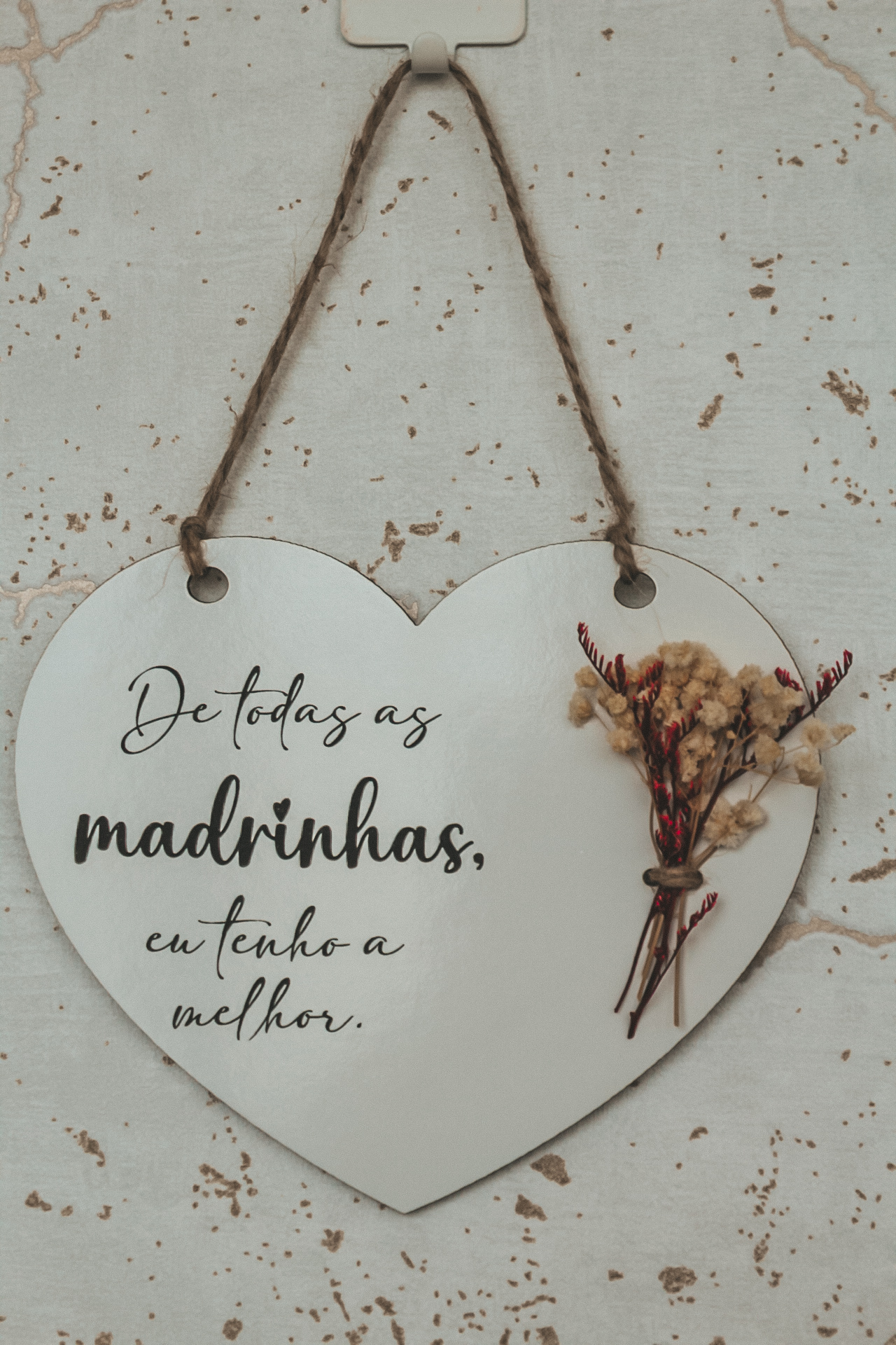• Placa decorativa em forma de coração com texto em português e flores secas pendurada numa parede rústica