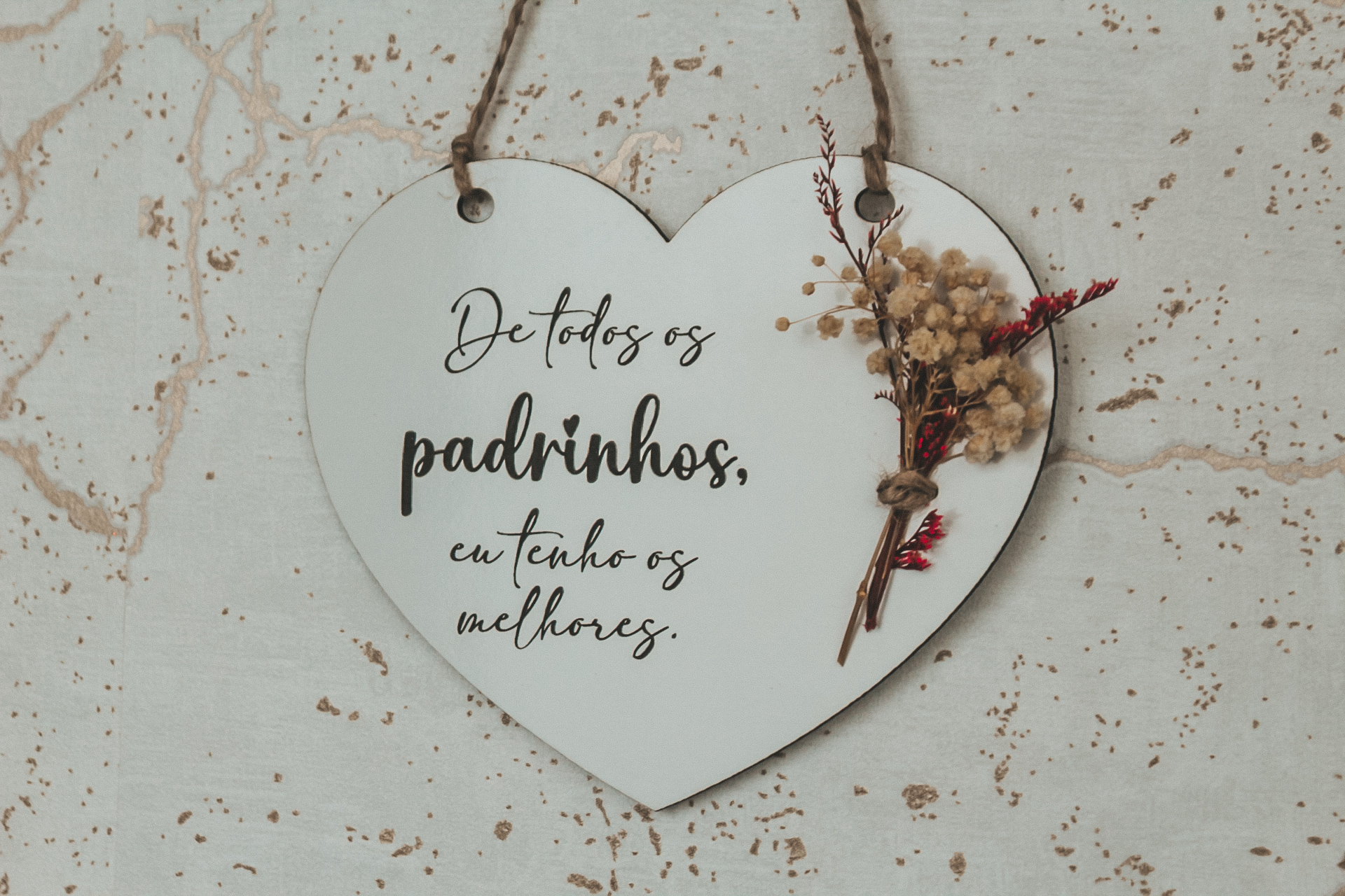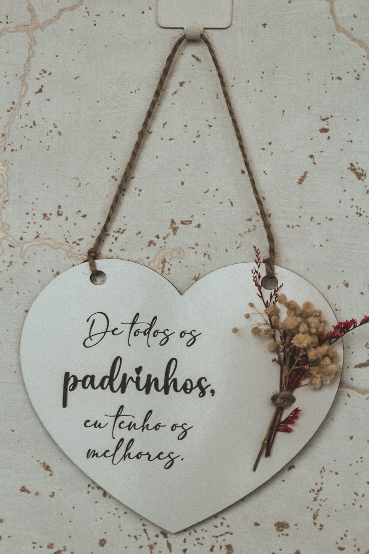 • Placa de coração branca com texto em português e flores secas, pendurada na parede.