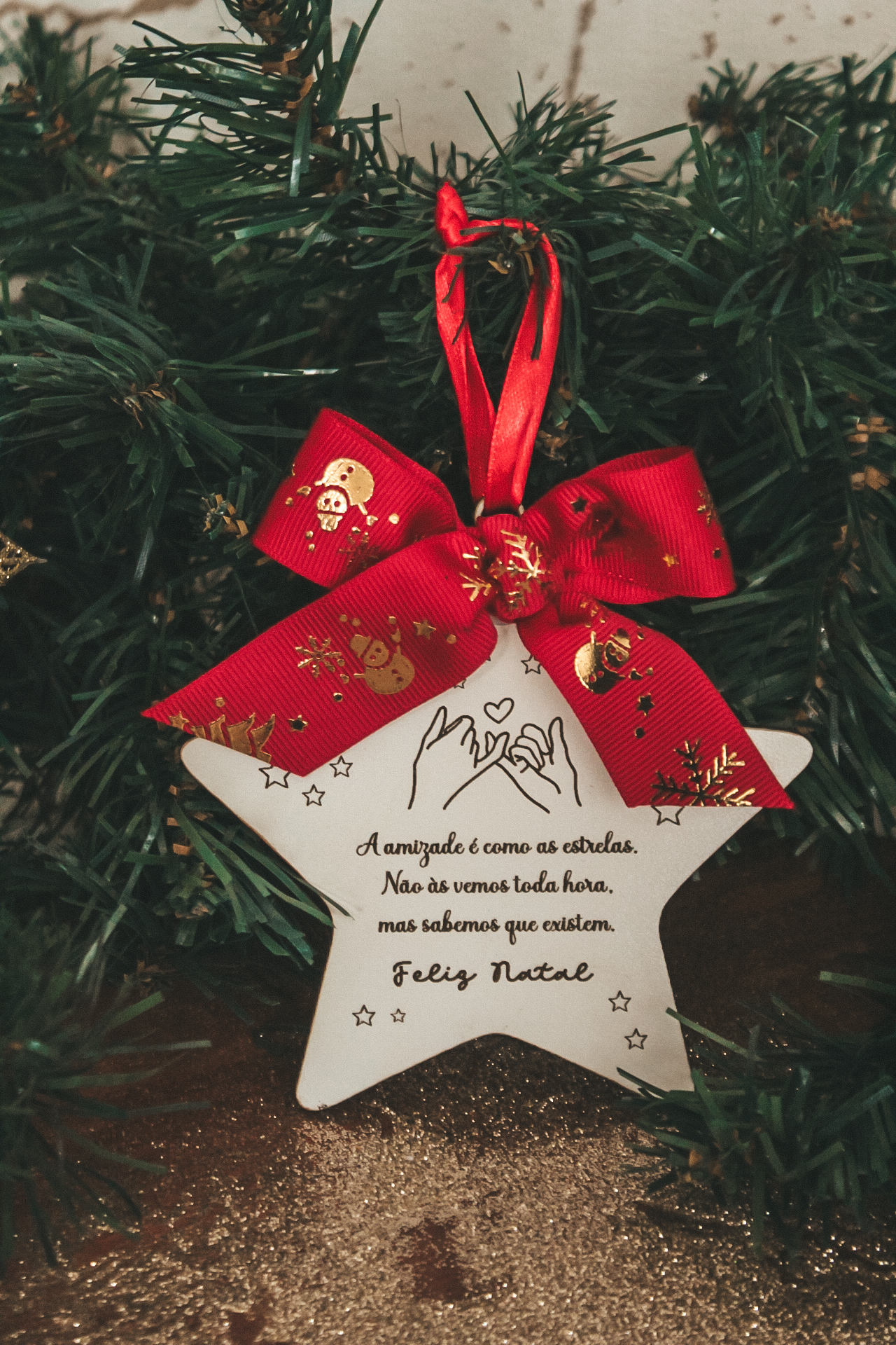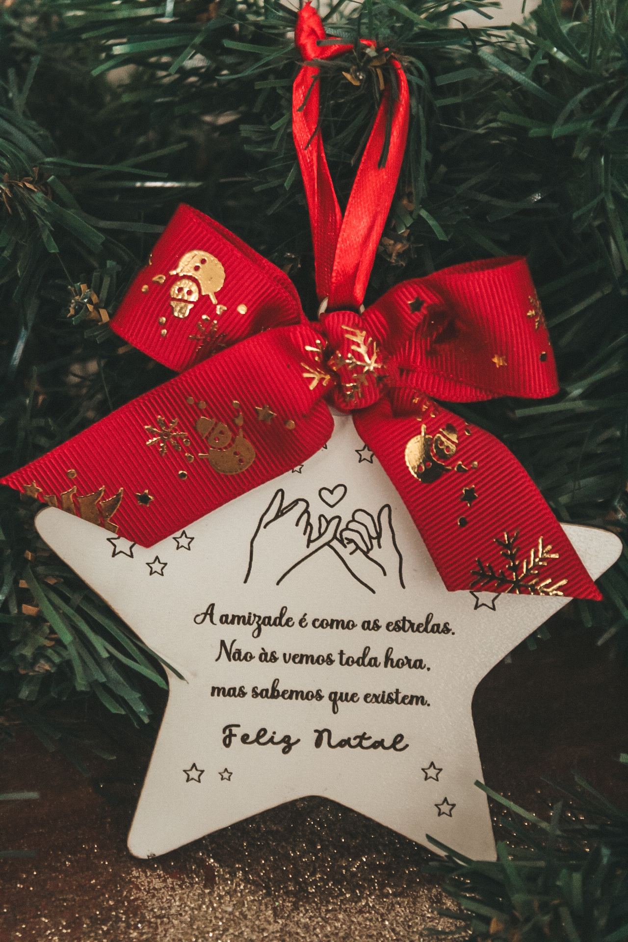 • Estrela branca decorativa com laço vermelho e mensagem de Natal pendurada em pinheiro