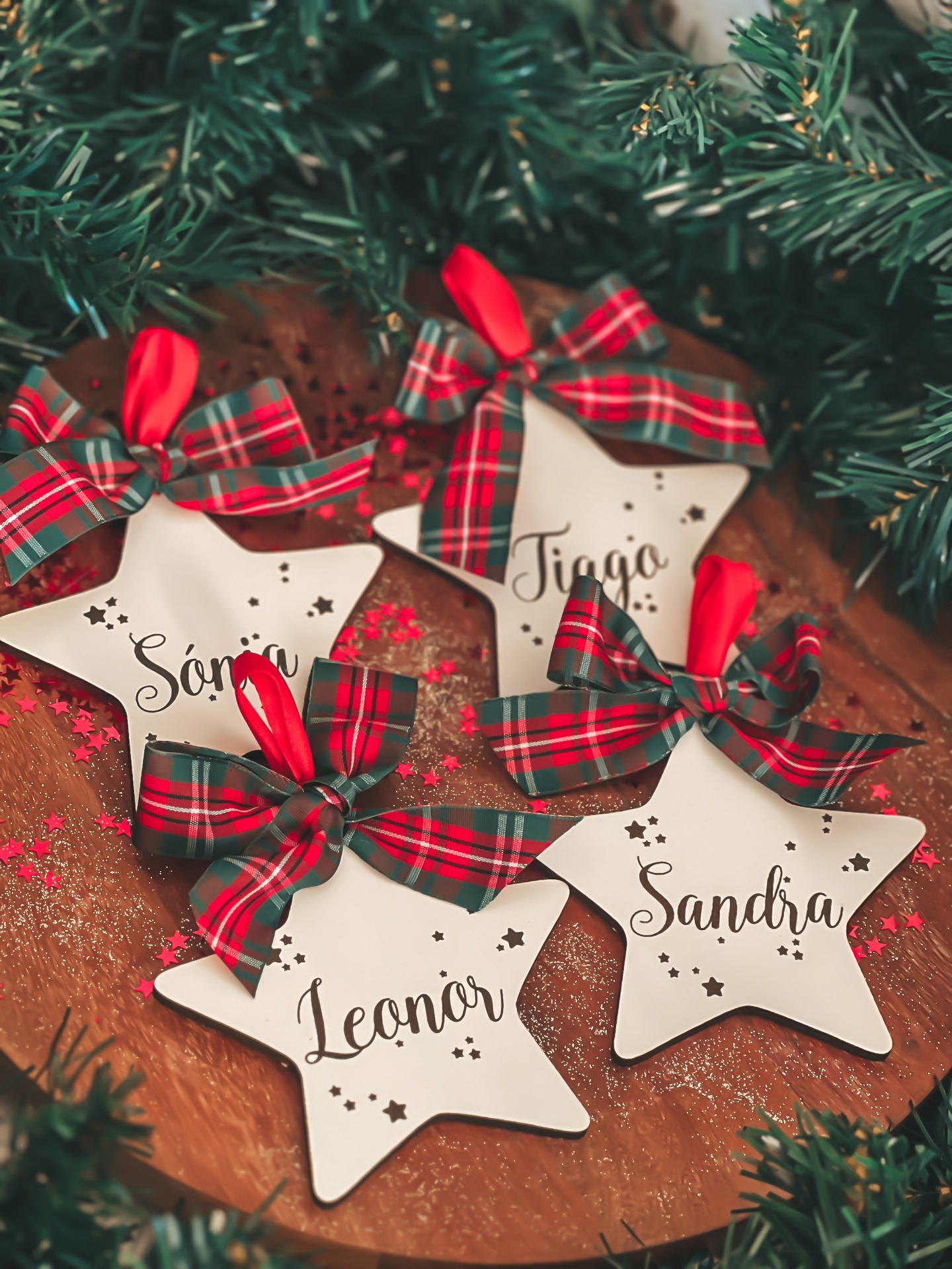• Enfeites de Natal em forma de estrela branca com fitas xadrez vermelhas e verdes e nomes escritos, sobre madeira com ramos de pinheiro verde