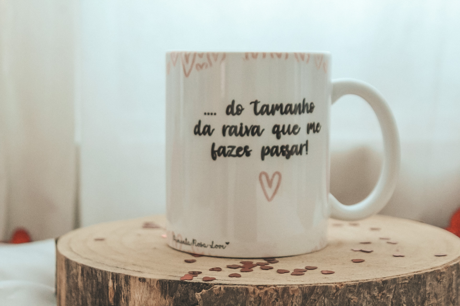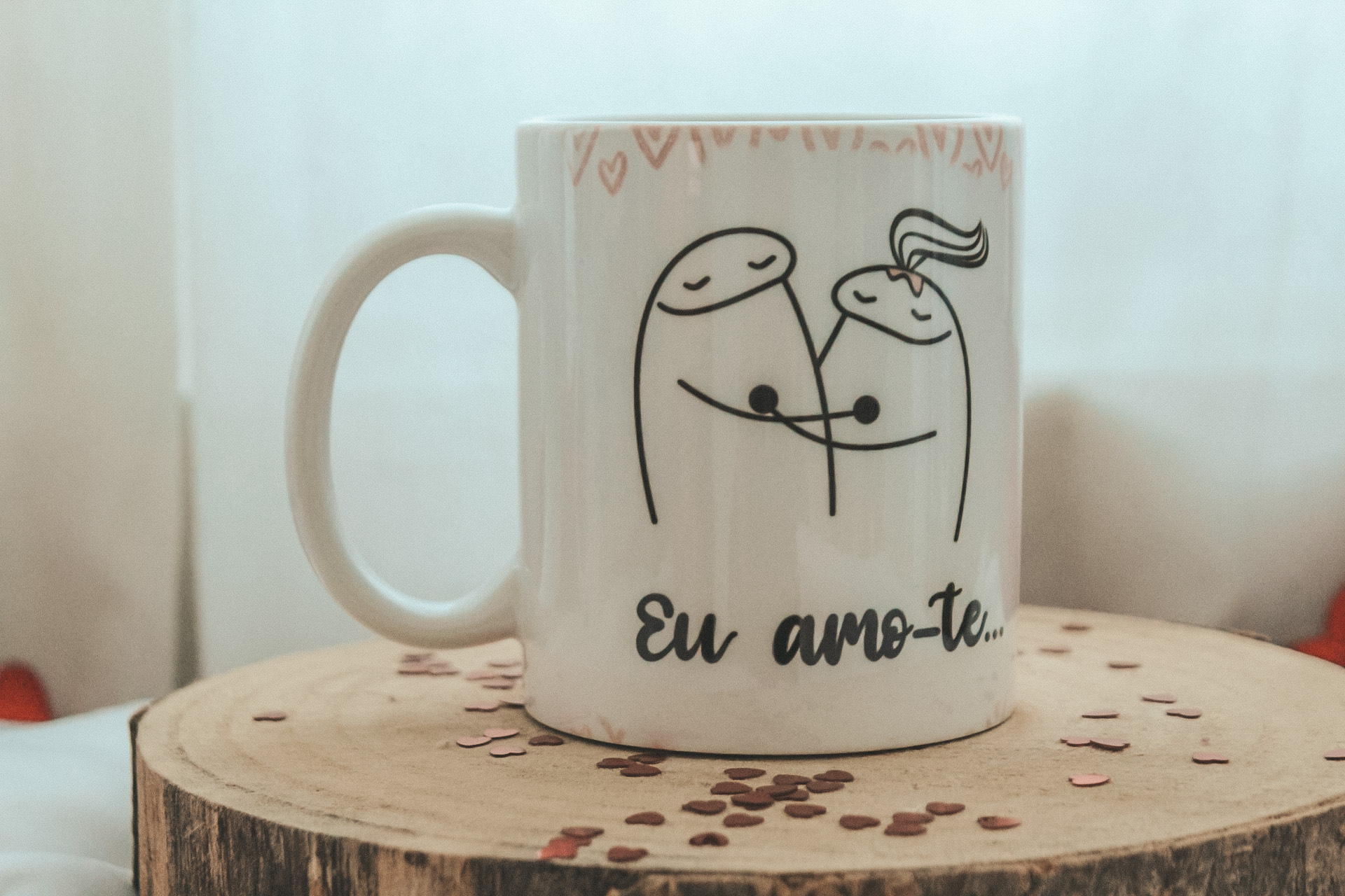 • Caneca branca com desenho de dois bonecos e texto 'Eu amo-te', sobre tronco de madeira com confetes.
