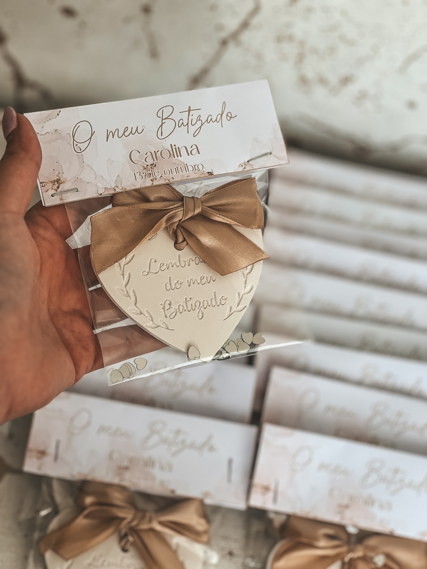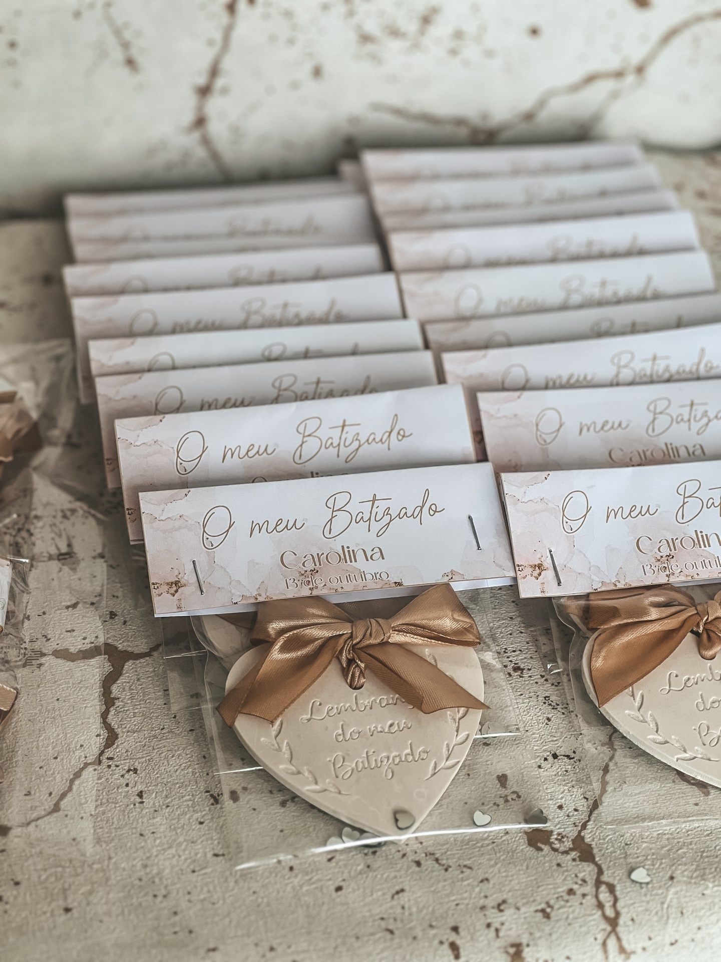 • Lembranças de batizado com corações decorativos e etiquetas brancas