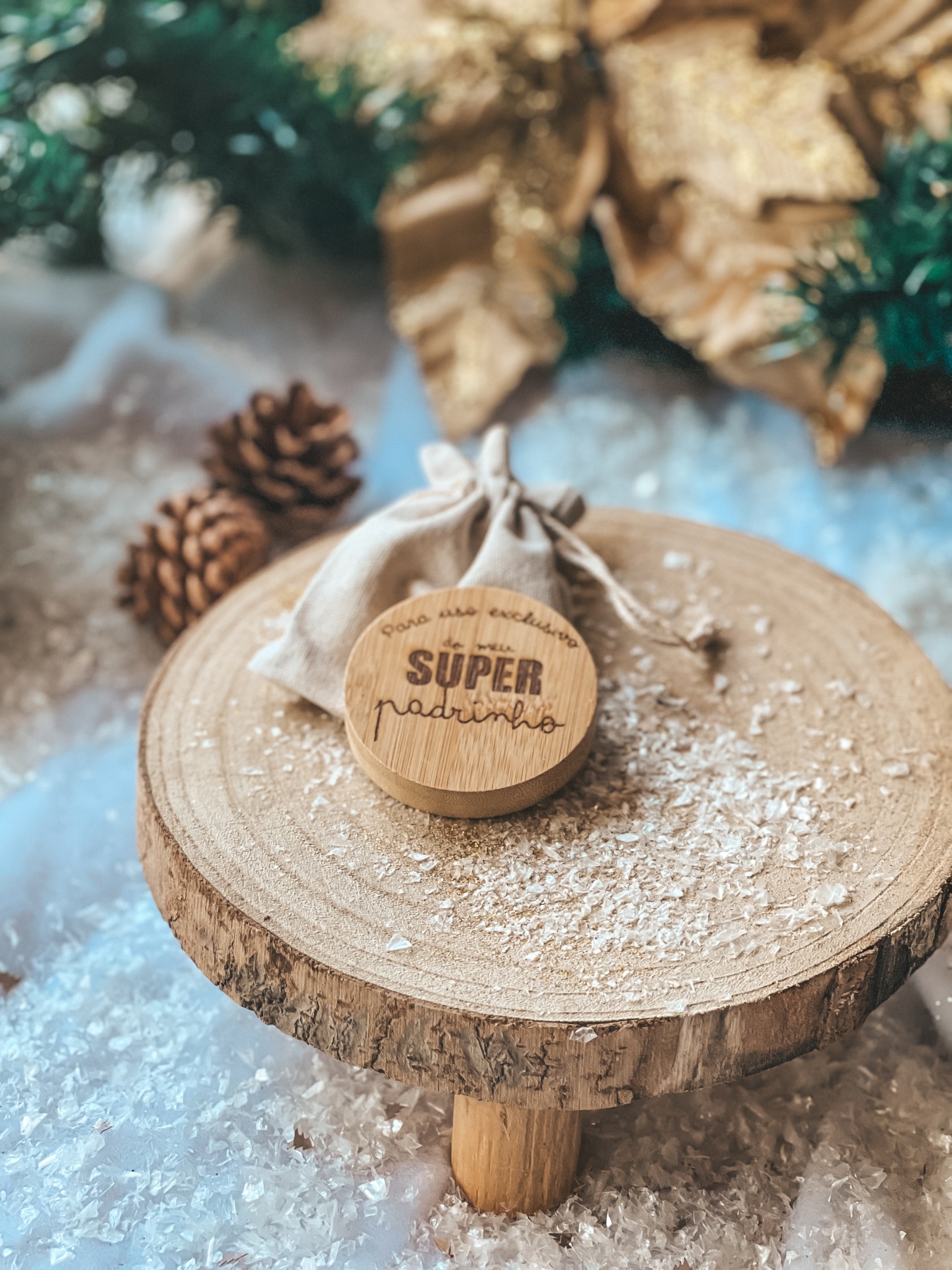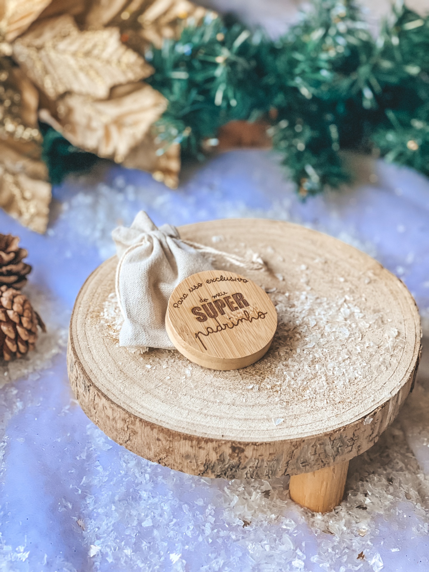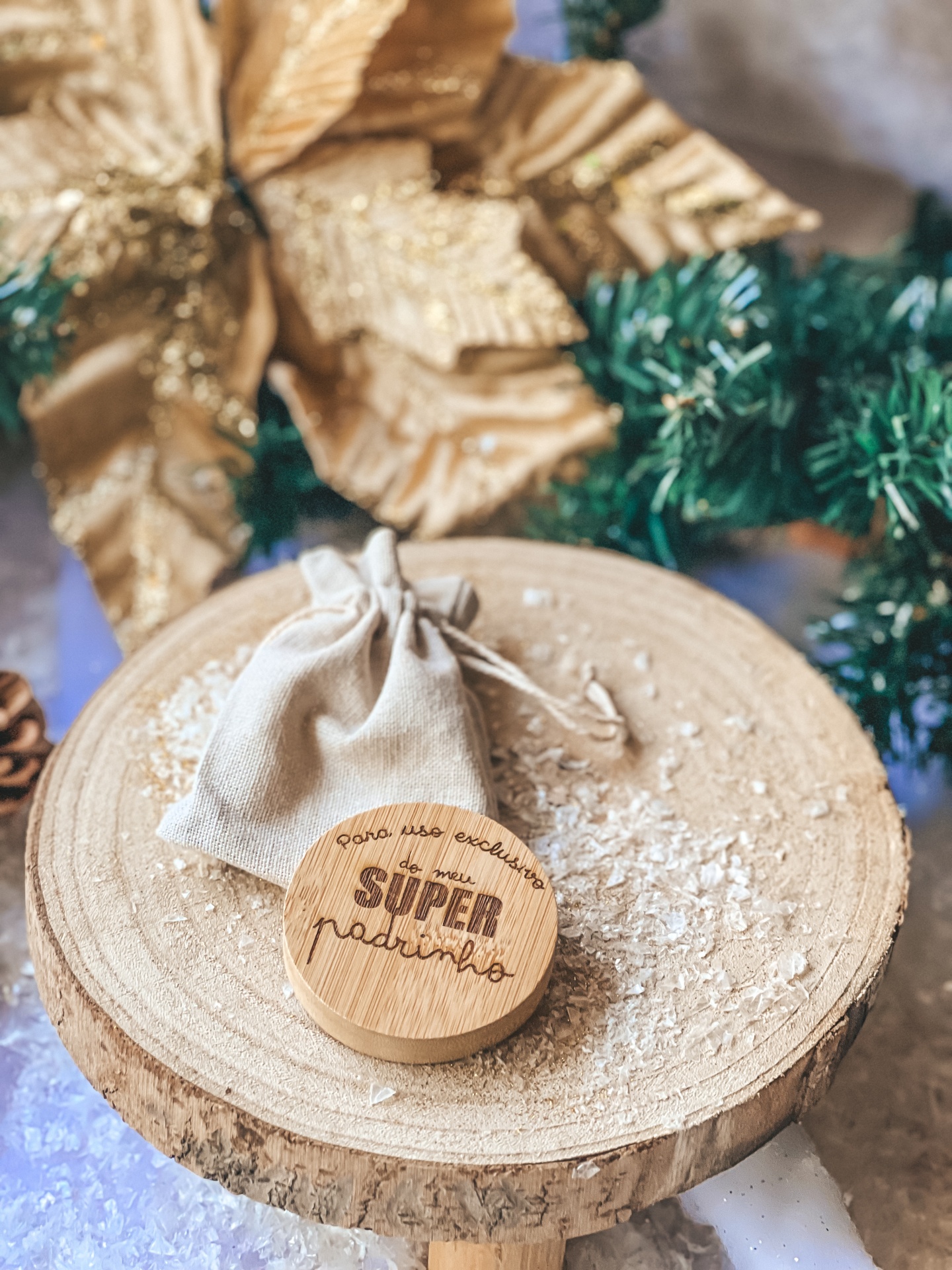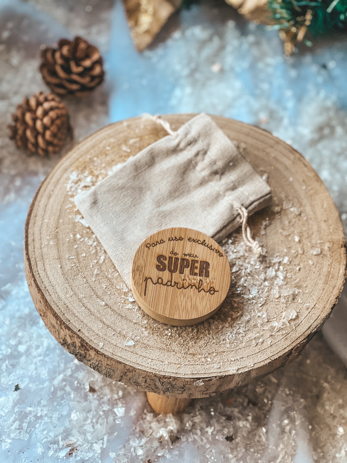 • Disco de madeira redondo com mensagem para padrinho e saco de pano sobre suporte de madeira rústico