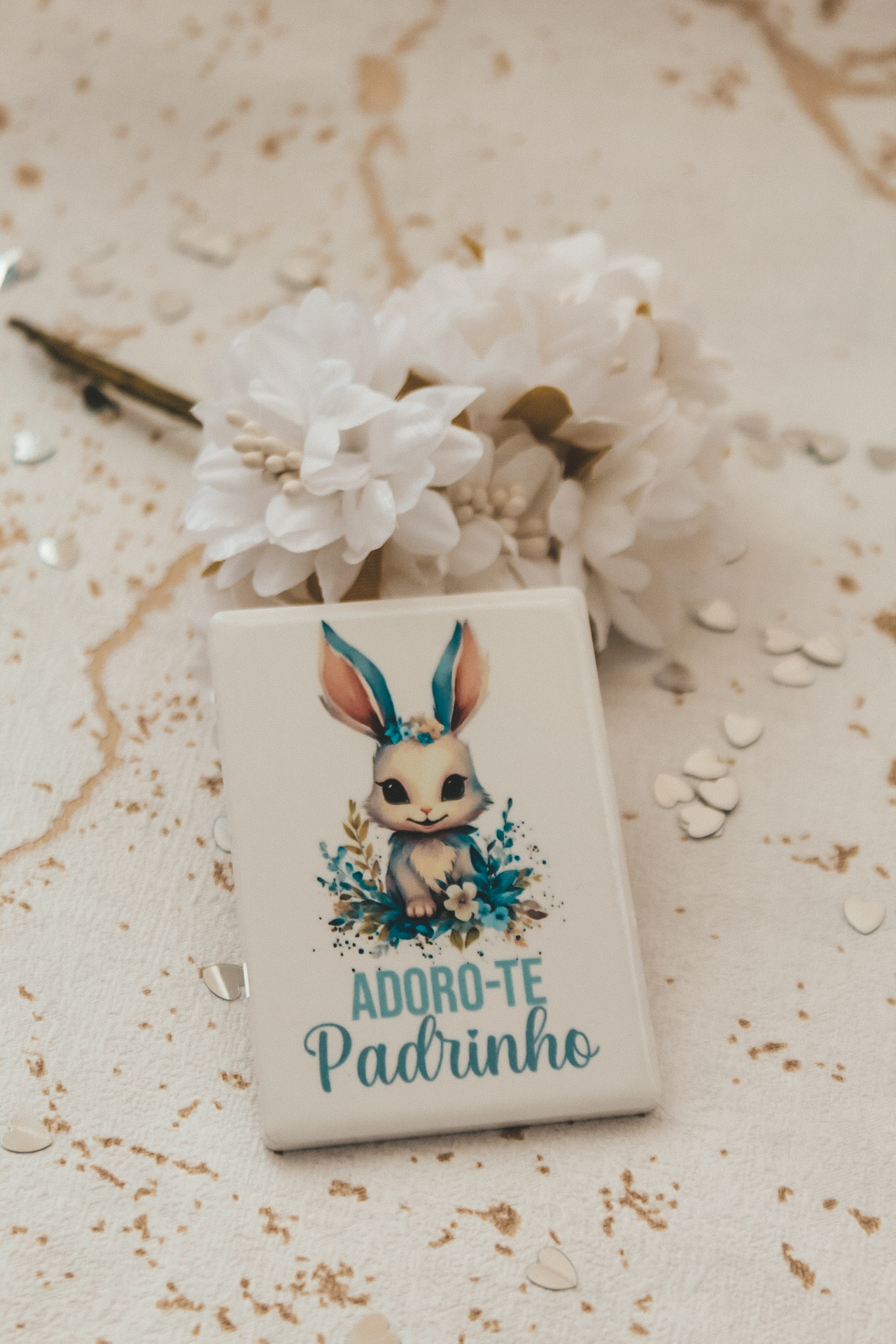• Pin com coelho e texto Adoro-te Padrinho, flores brancas e confetes na superfície