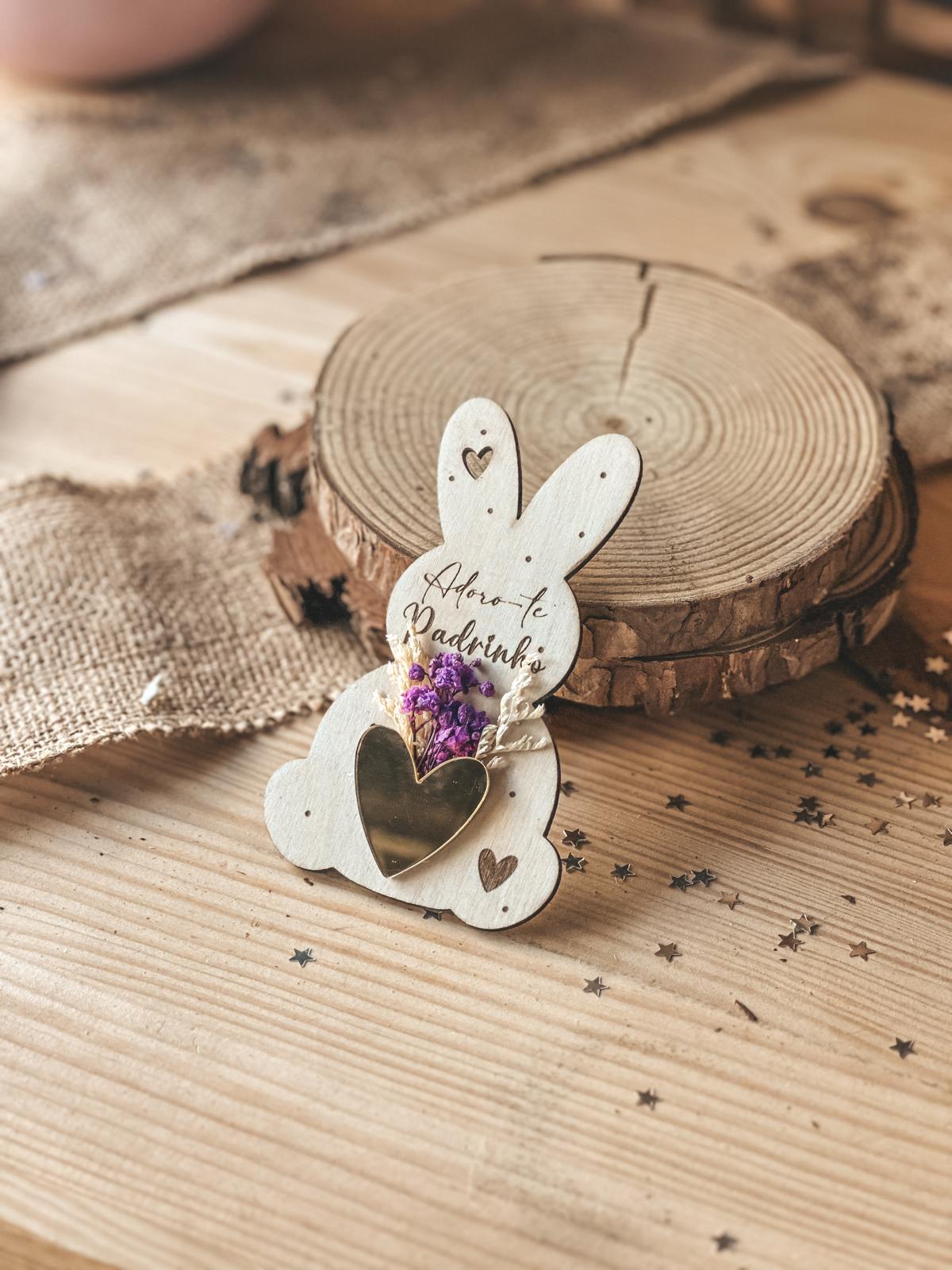 • Decoração de coelho em madeira com flores roxas e coração dourado