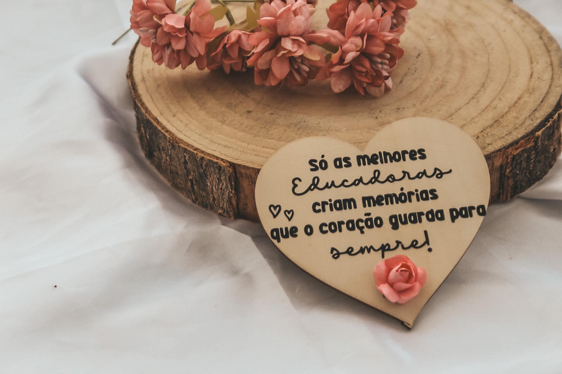 • Placa de madeira em forma de coração com texto em português, flor rosa, sobre base de madeira e coroa de flores rosa.