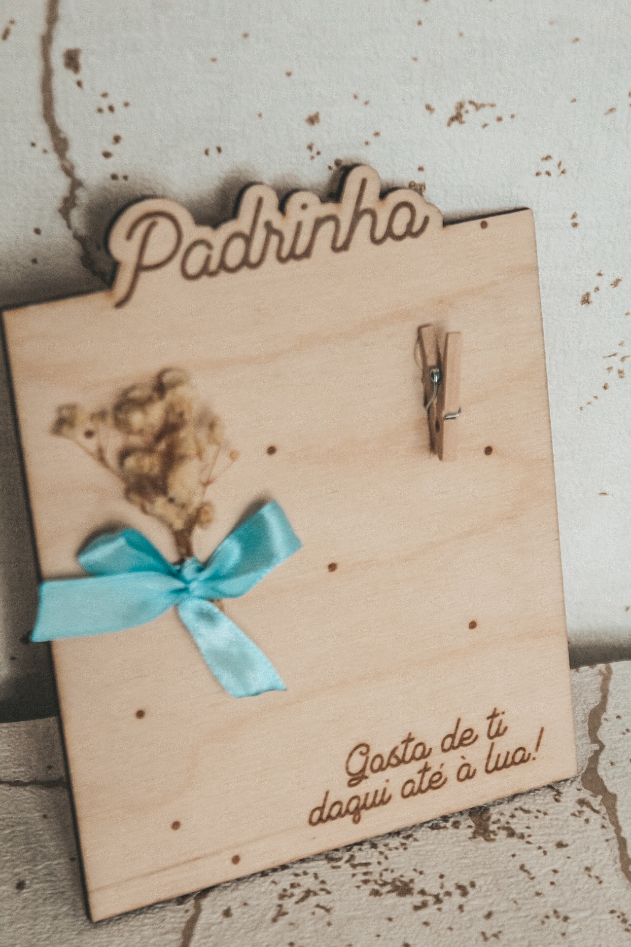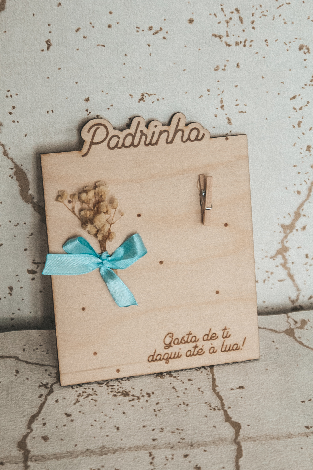 • Placa de madeira decorativa com texto 'Padrinho' e 'Gosto de ti daqui até à lua!' com flores secas e fita azul