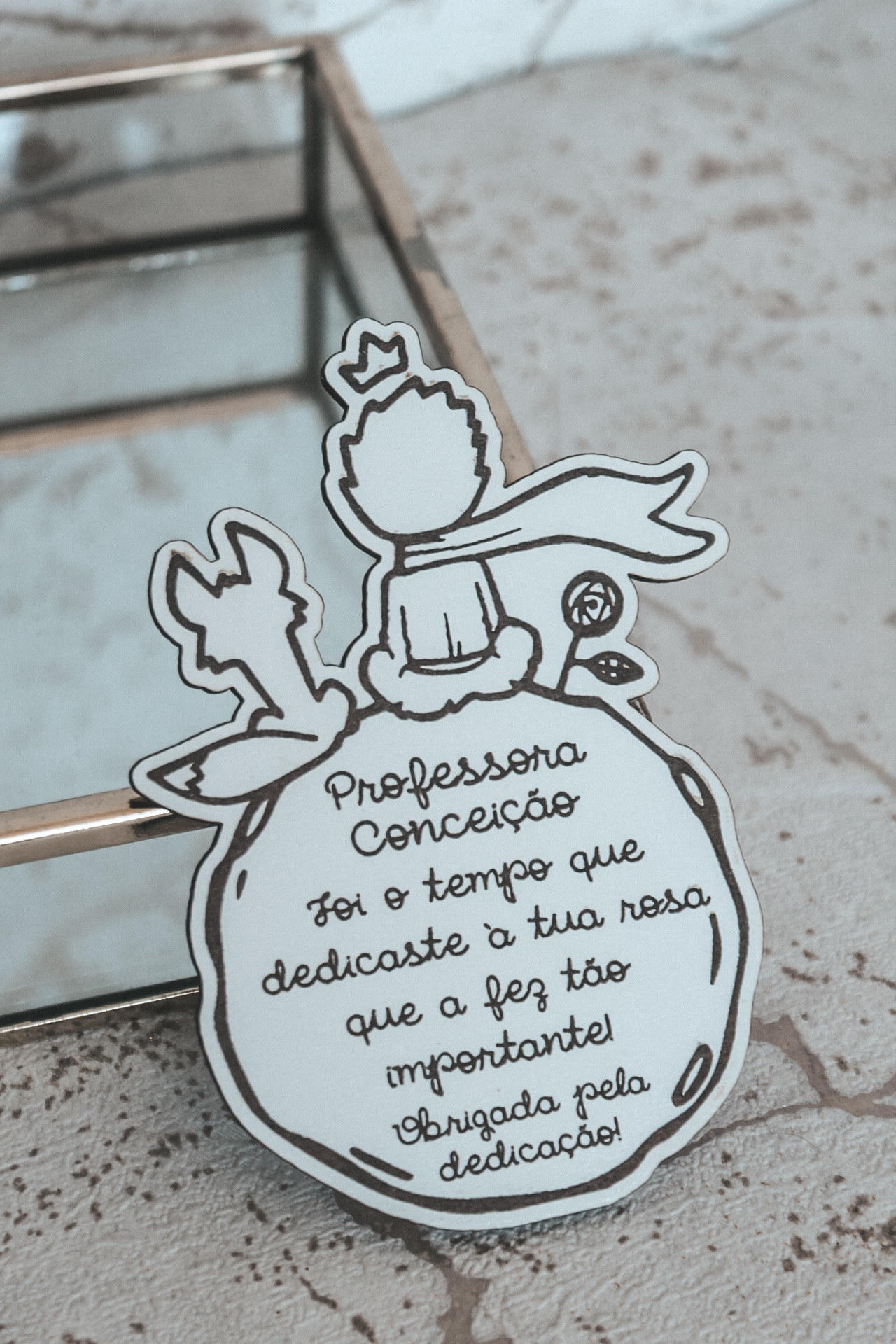 • Etiqueta decorativa branca com texto manuscrito a agradecer professora Conceição e desenho do Pequeno Príncipe