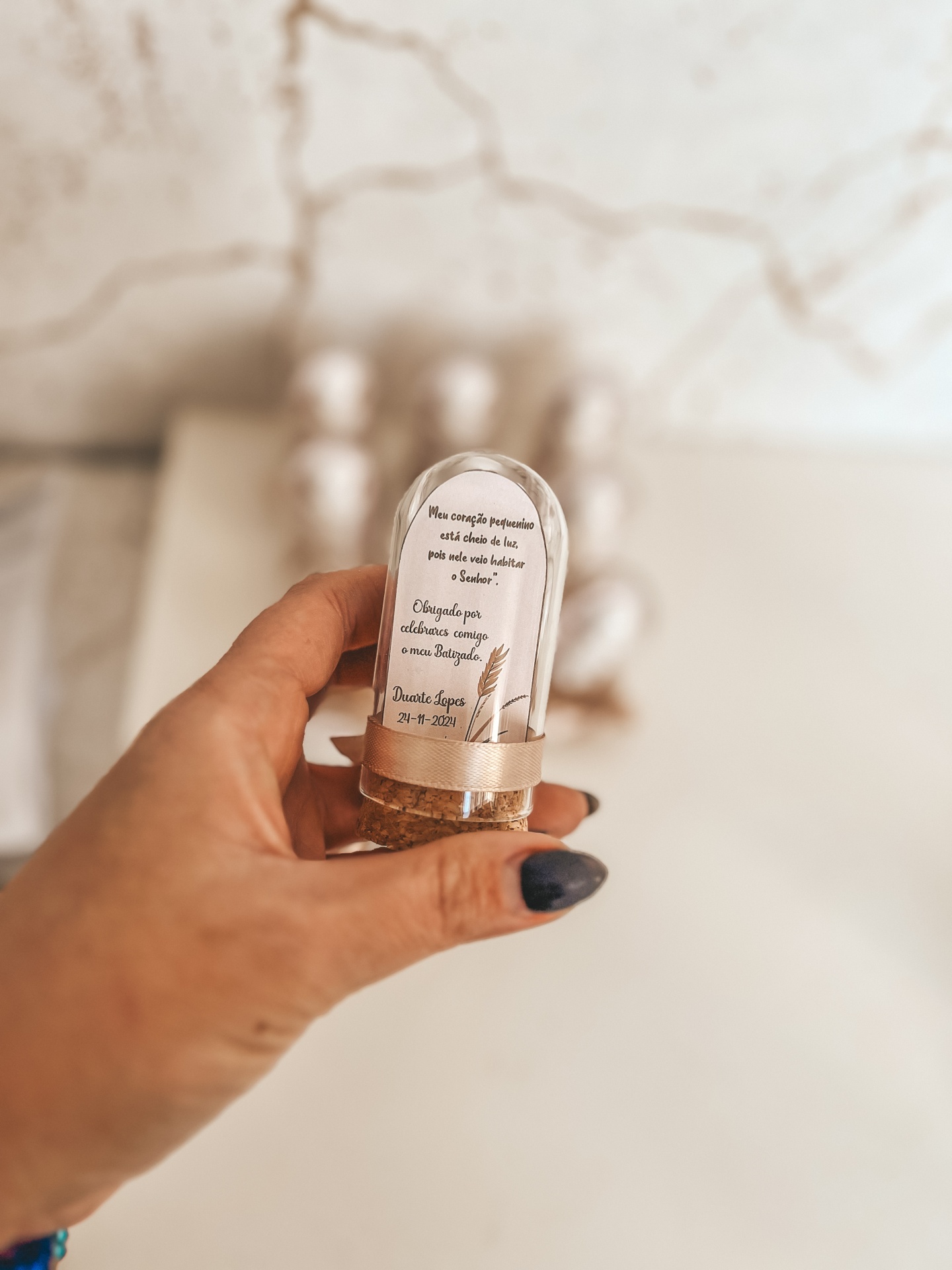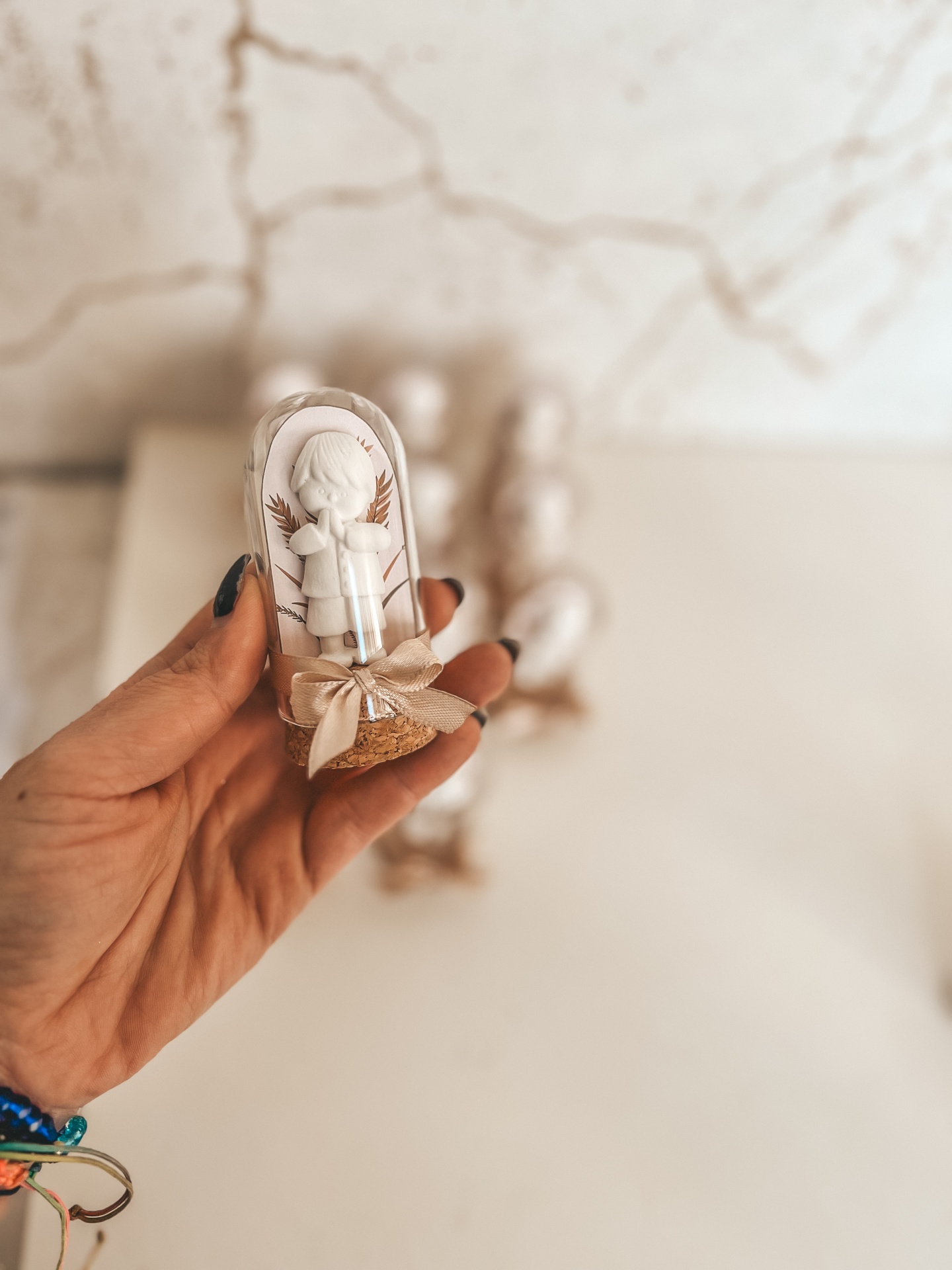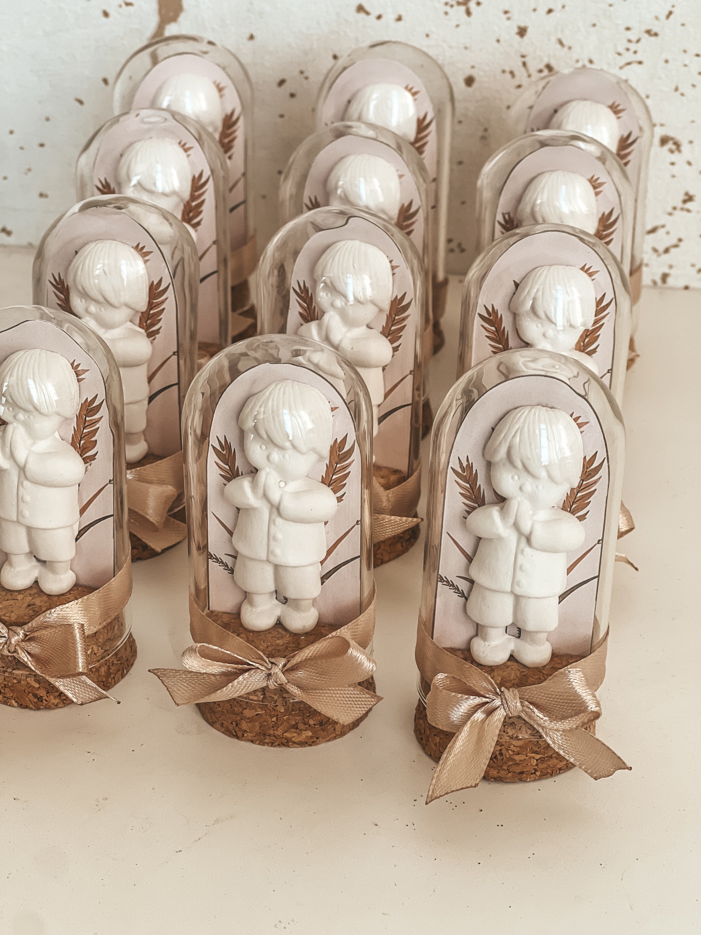 • Figuras de menino em resina dentro de cúpulas de vidro com base de cortiça e laço dourado