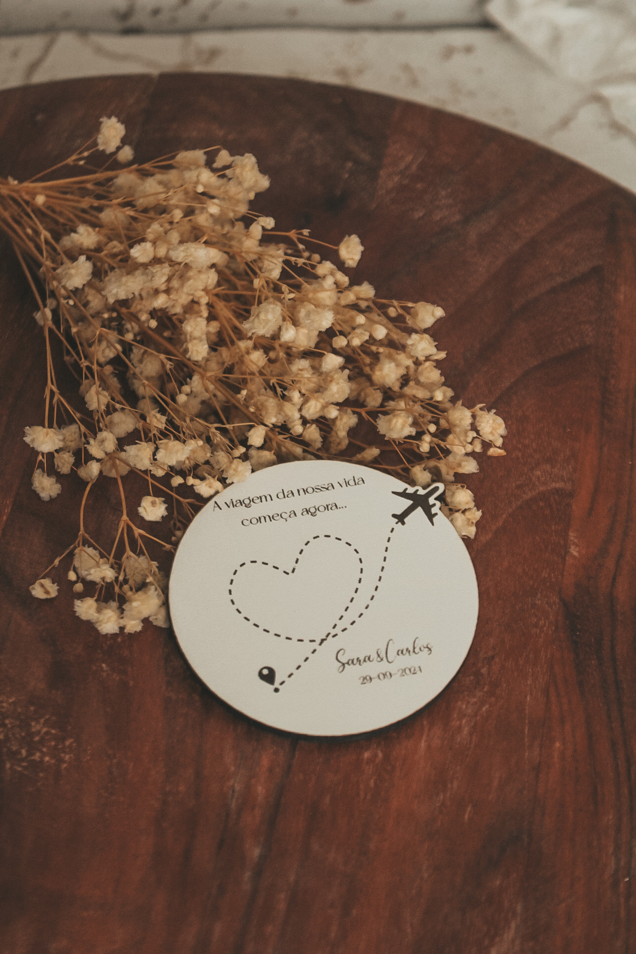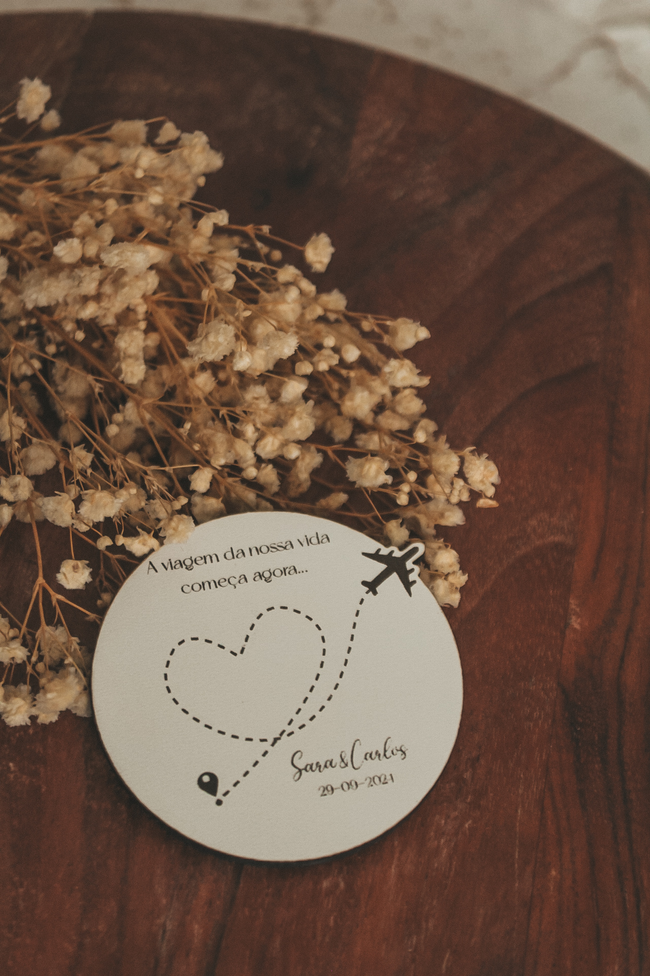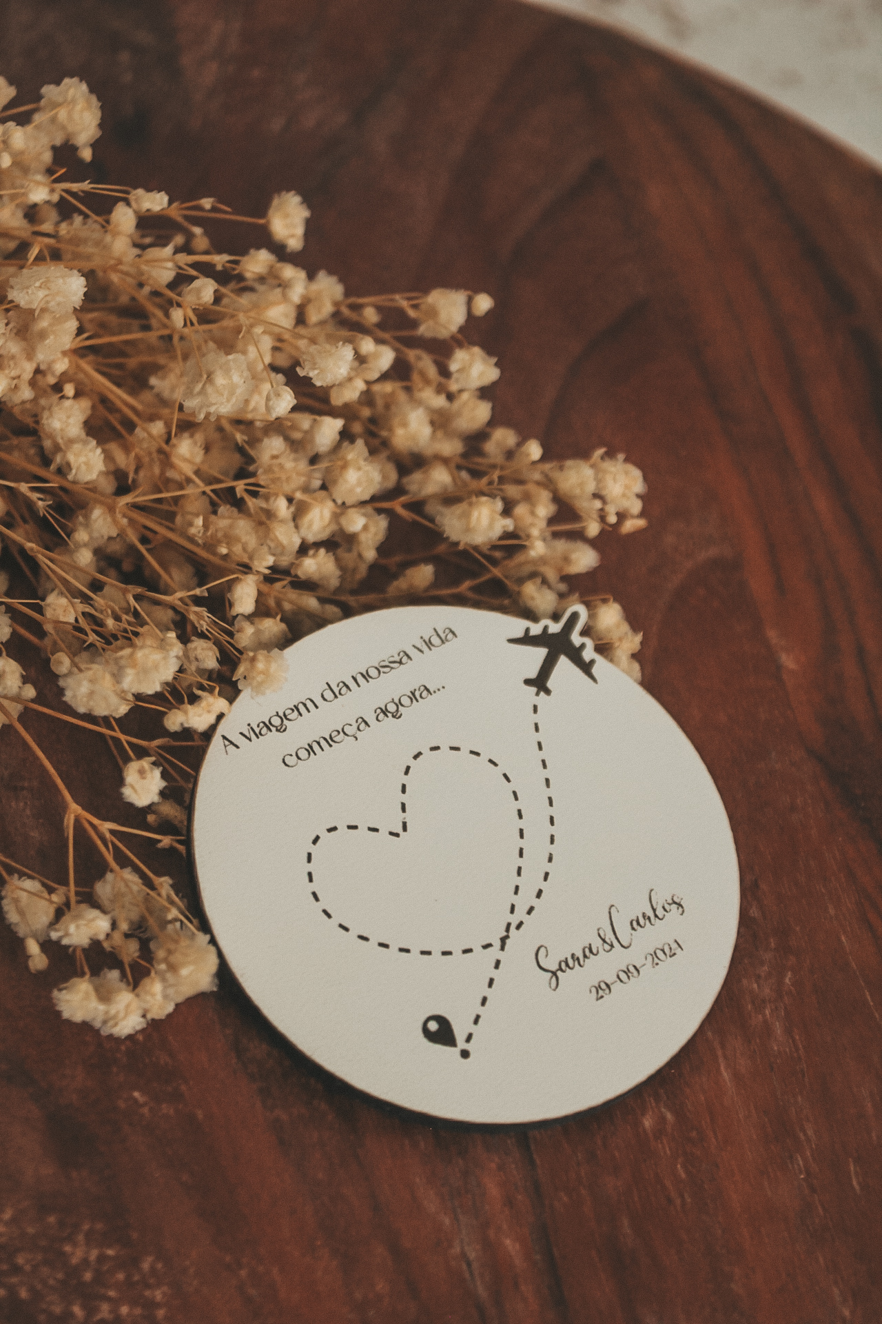 • Cartão circular com texto e desenho de avião ao lado de flores secas sobre mesa de madeira