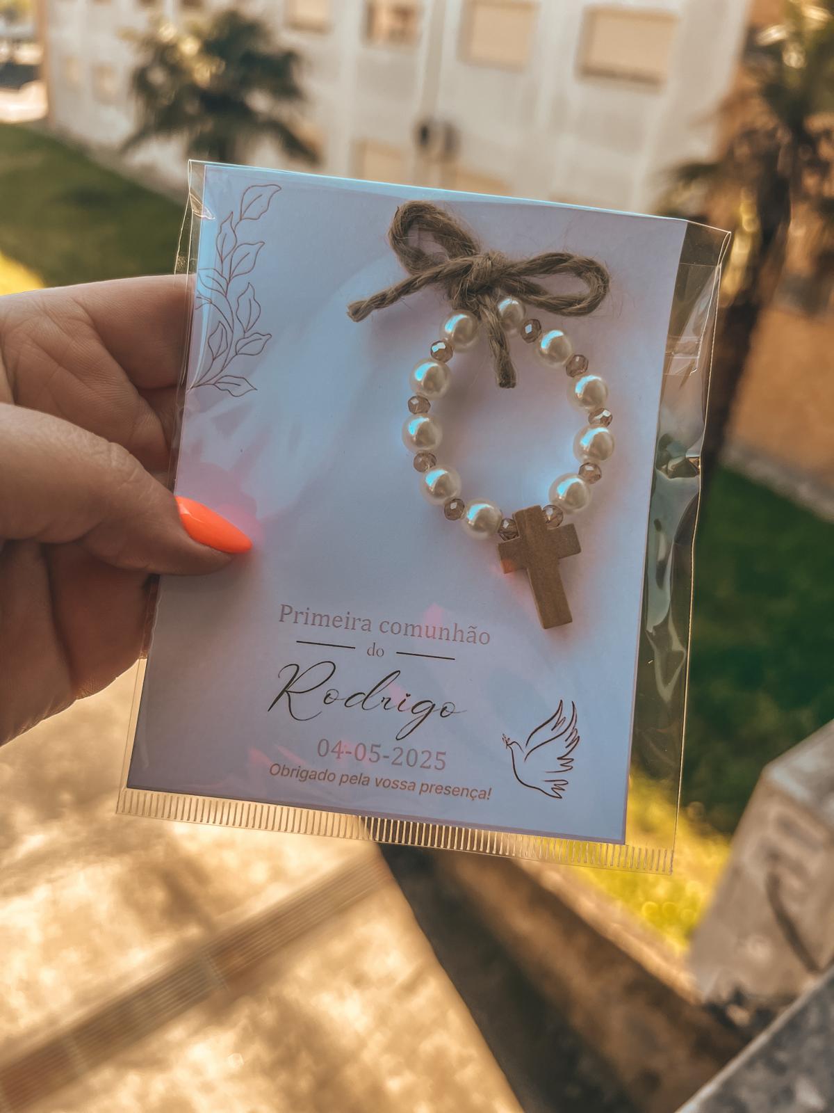 • Lembrança de primeira comunhão com pulseira de contas brancas e cruz de madeira em cartão branco.