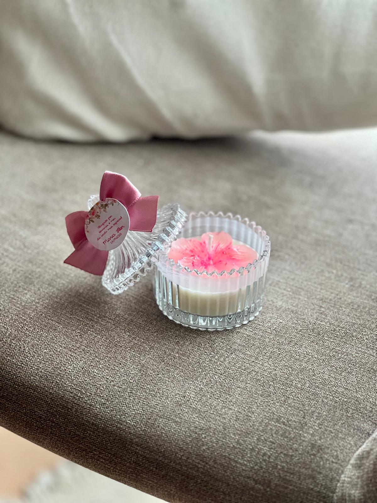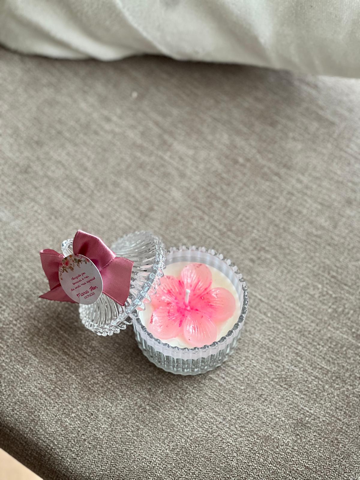 • Vela decorativa em caixa de vidro com tampa e laço rosa