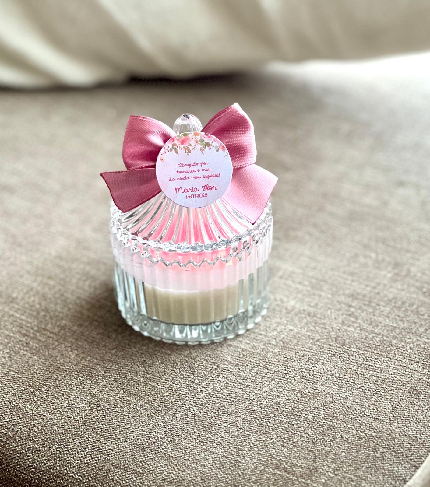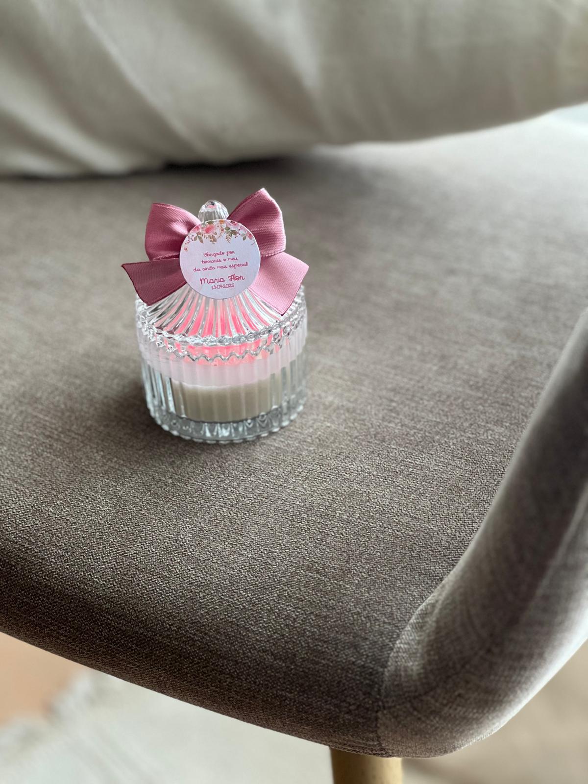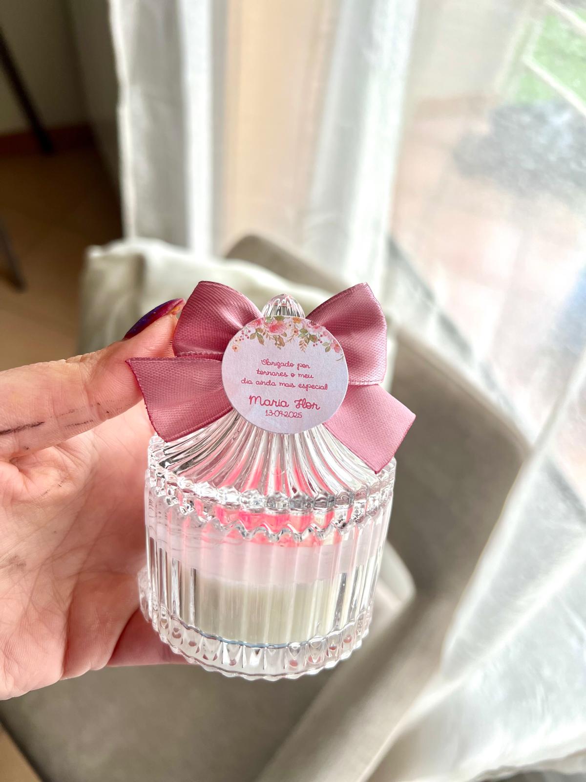 • Vela em vidro com laço rosa e etiqueta personalizada