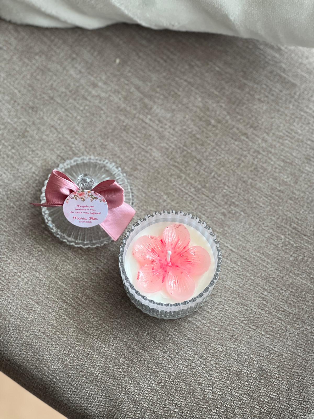 • Vela decorativa branca com flor rosa em recipiente de vidro com tampa e laço