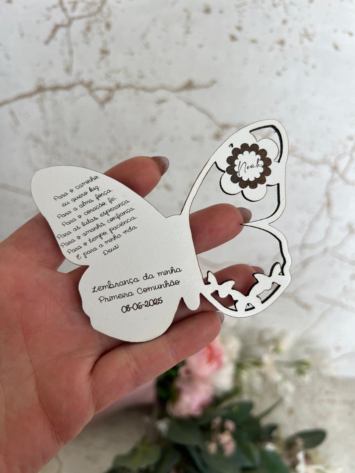 • Cartão em forma de borboleta com texto sobre Primeira Comunhão, segurado por mão com unhas castanho claro