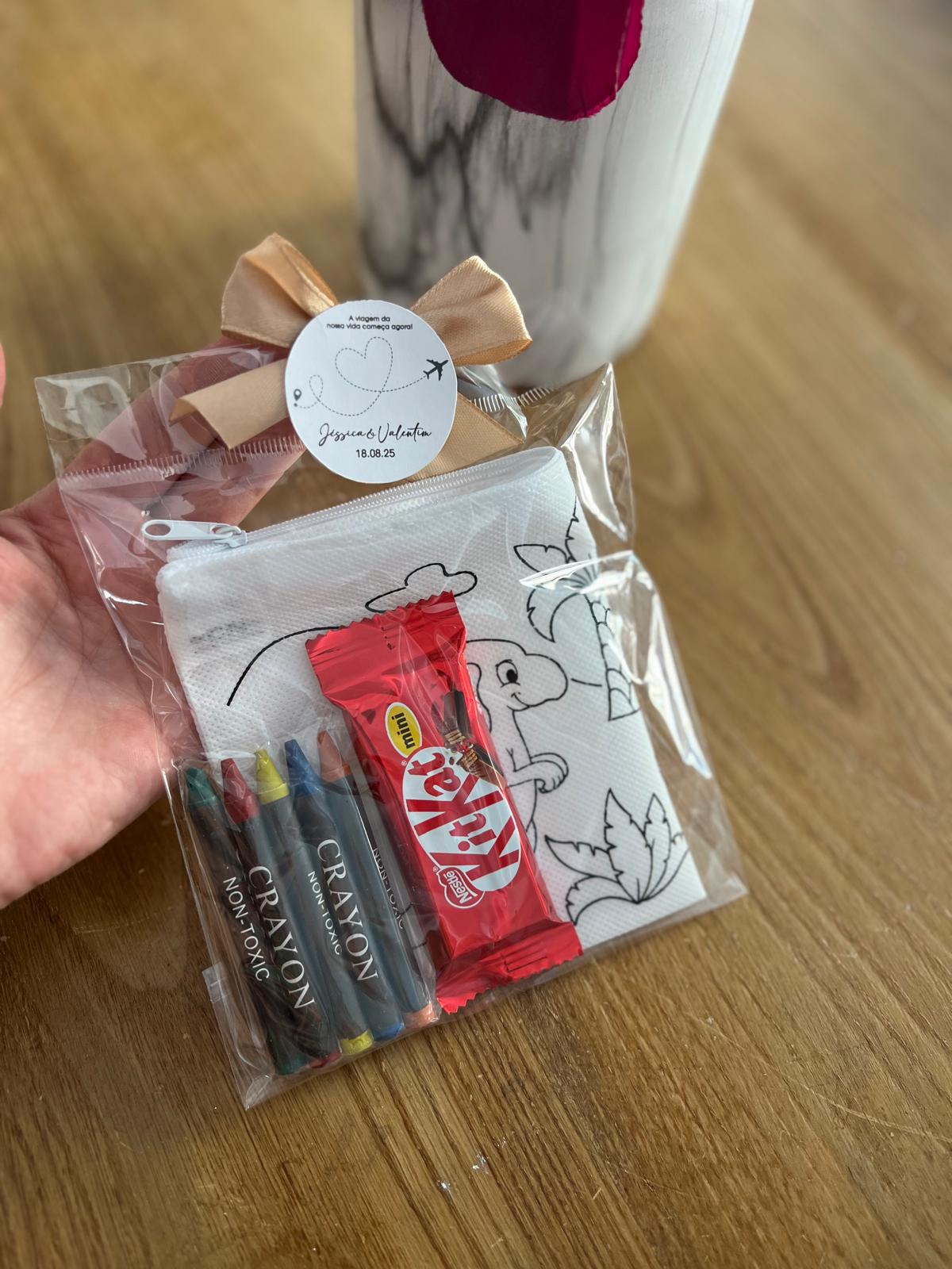 • Conjunto embalado com bolsa para colorir, lápis de cera e chocolate KitKat