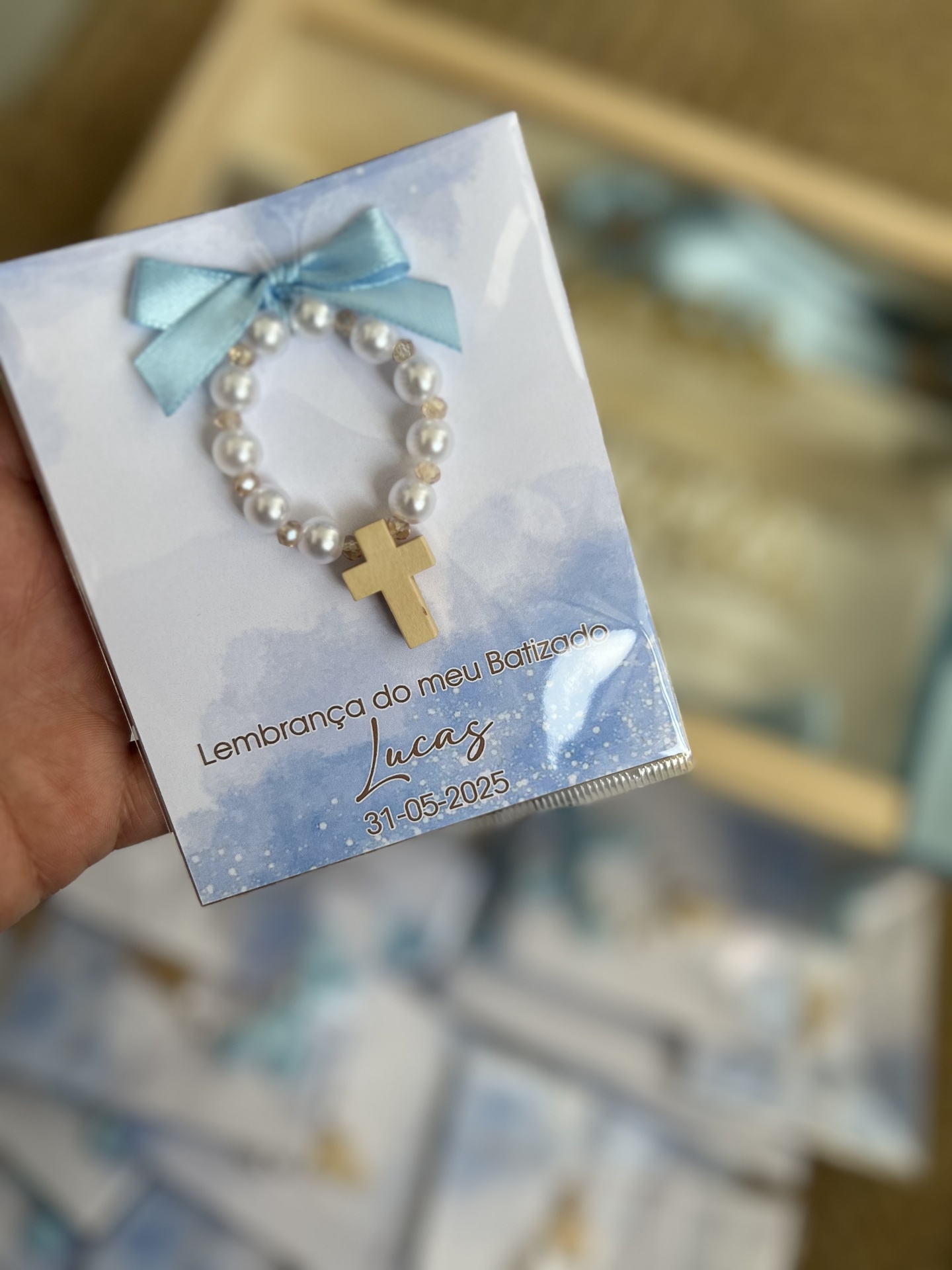 • Pulseira branca com cruz dourada e laço azul em cartão de batizado com texto